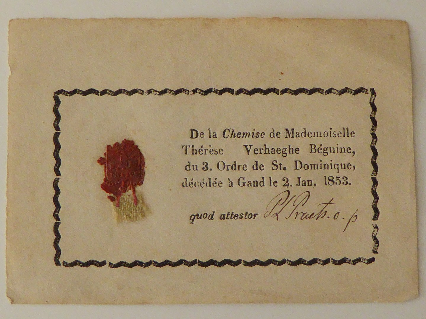 Reliek van het hemd van Thérèse Verhaeghe, begijn van de 3e orde van St. Dominicus, overleden te Gent op 2 jan. 1853