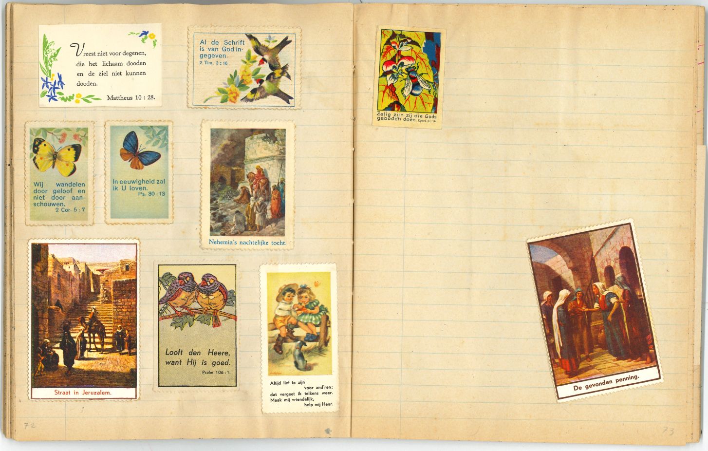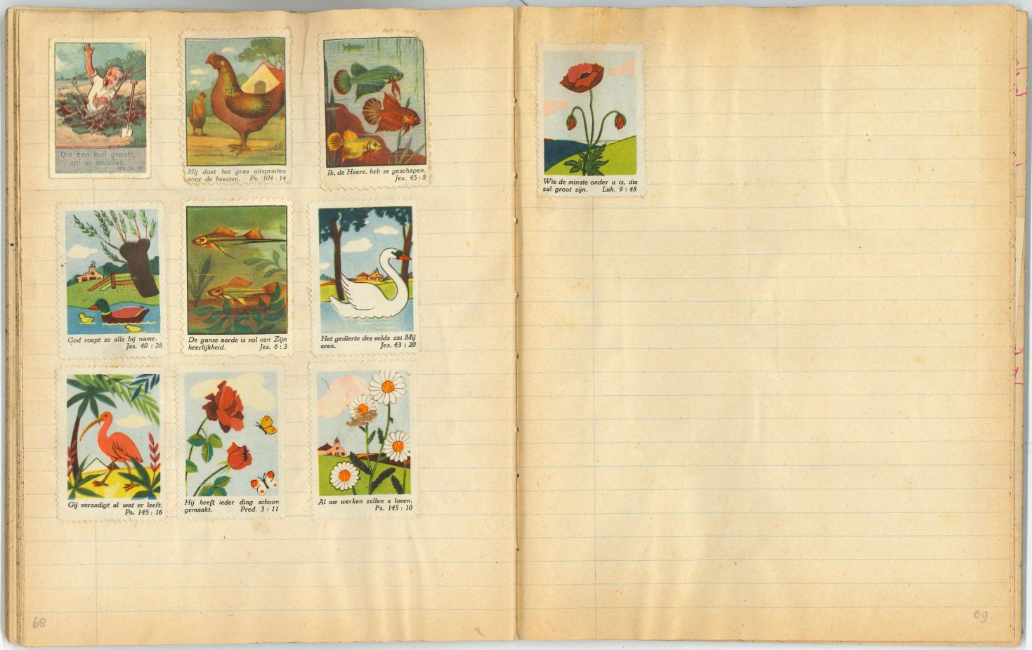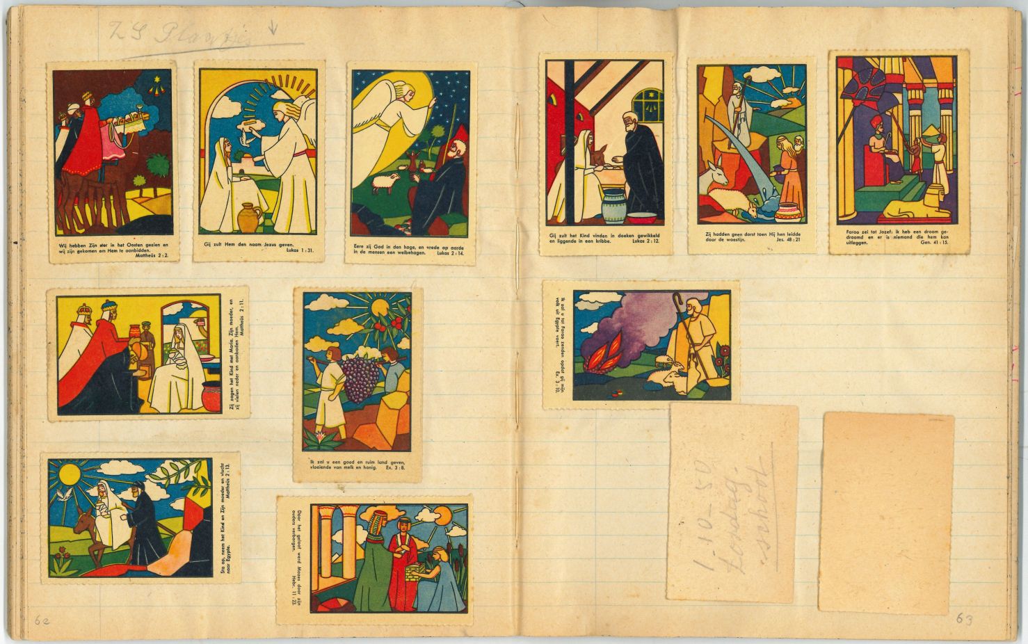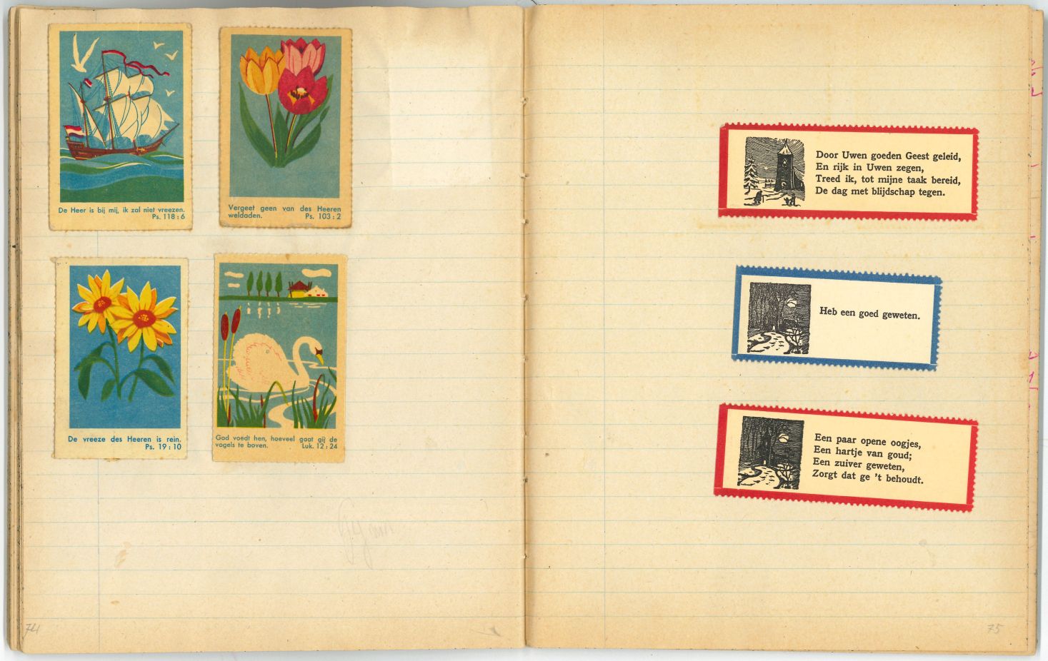 Schrift met tekeningen, aantekeningen en protestantse beloningsplaatjes van de zondagsschool en de lagere school
