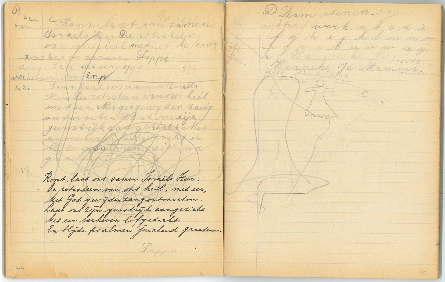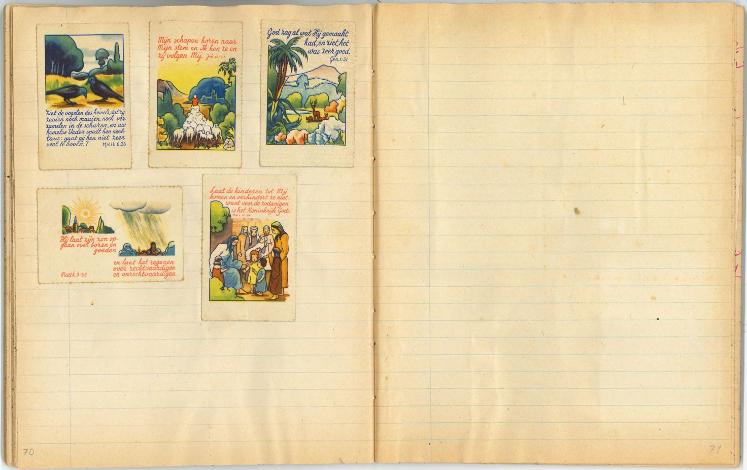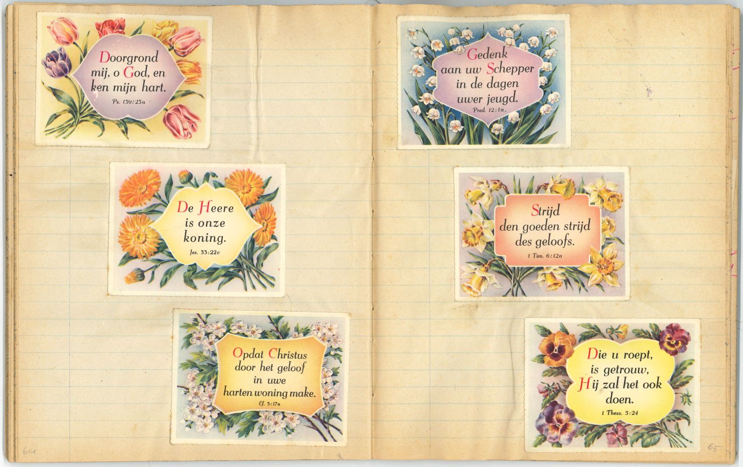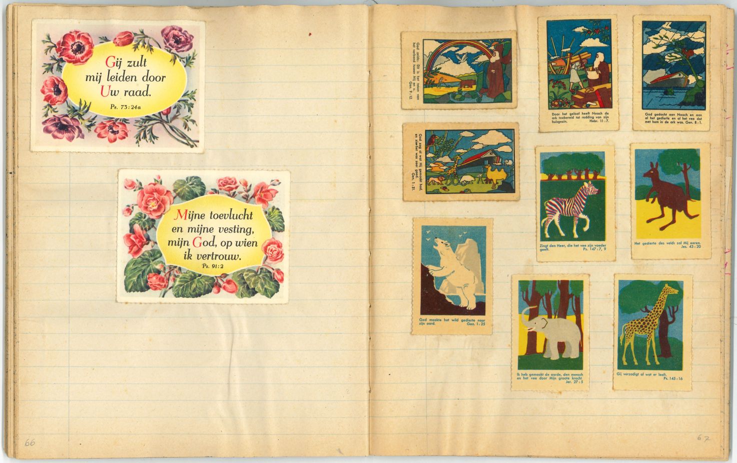 Schrift met tekeningen, aantekeningen en protestantse beloningsplaatjes van de zondagsschool en de lagere school