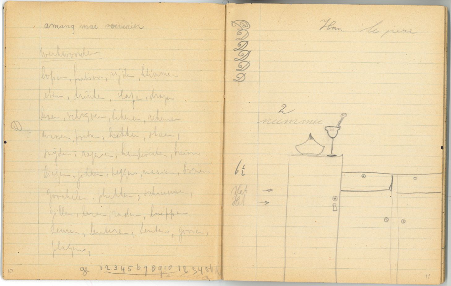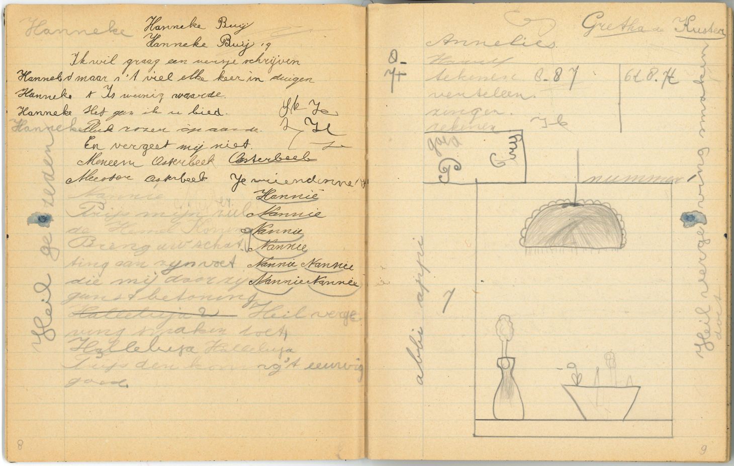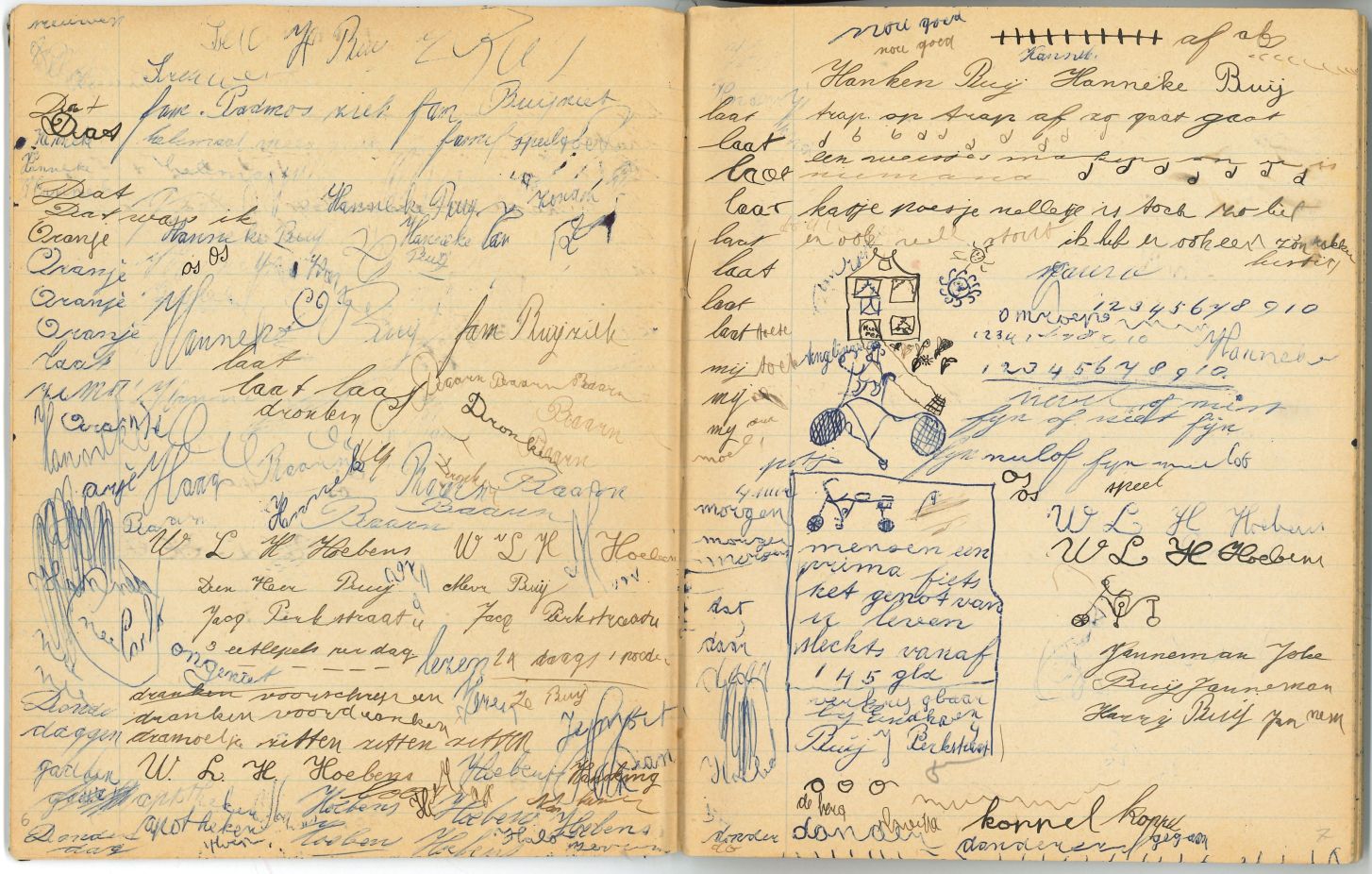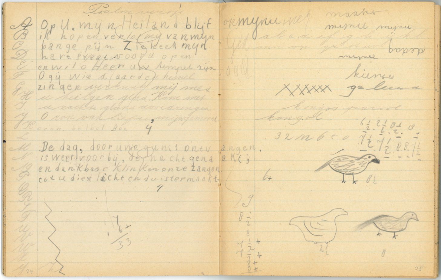 Schrift met tekeningen, aantekeningen en protestantse beloningsplaatjes van de zondagsschool en de lagere school