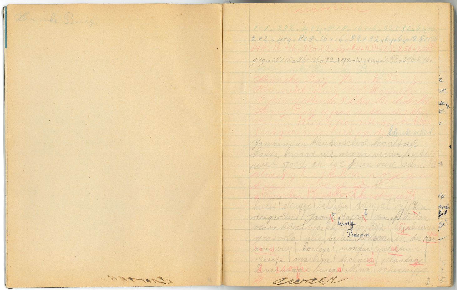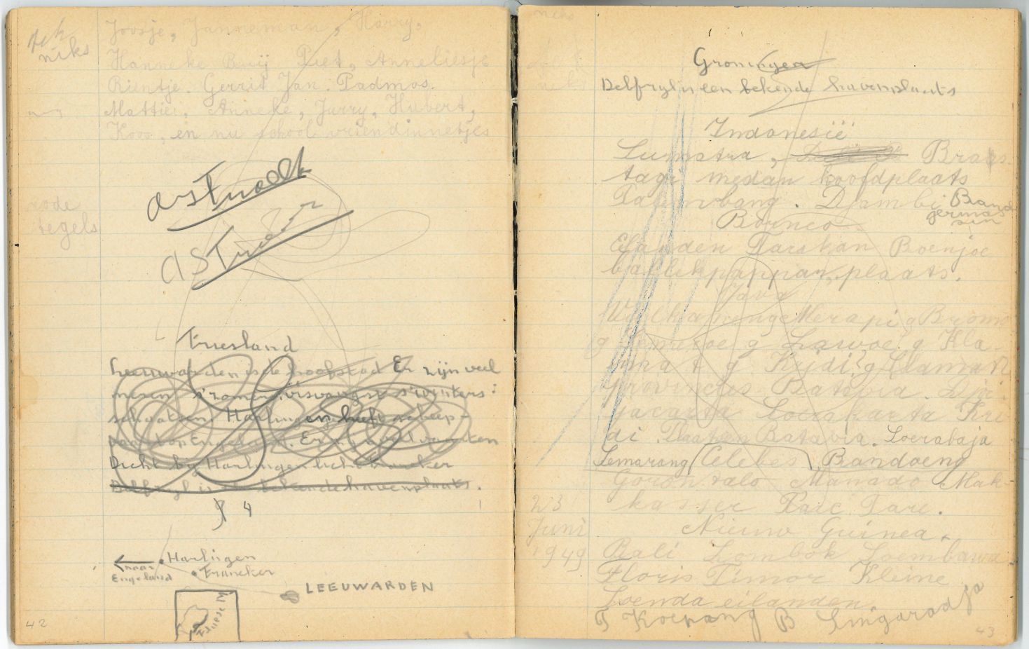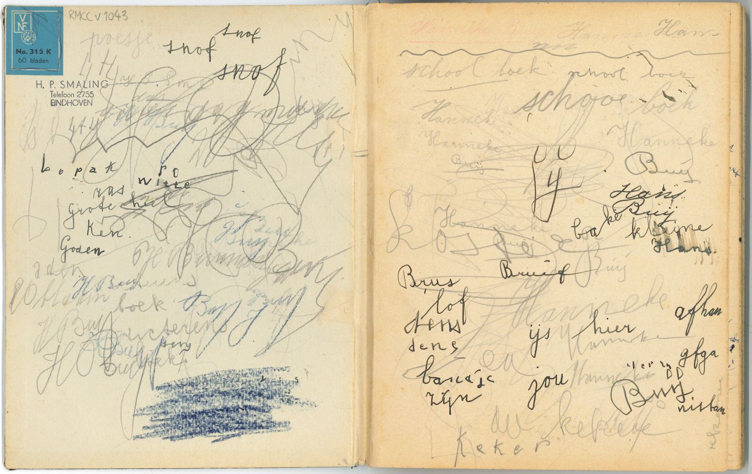 Schrift met tekeningen, aantekeningen en protestantse beloningsplaatjes van de zondagsschool en de lagere school. In het schrift waren bij het in ontvangst nemen allemaal losse briefjes aangebracht met aantekeningen en overgeschreven versjes: p. 3 op de onderste helft stond de aantekening: "Janneman: 26 febr. Geb. 1946, is 2 jaar oud" p. 6 in het midden ...