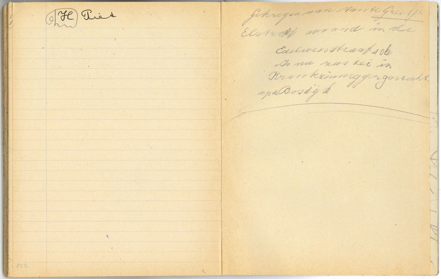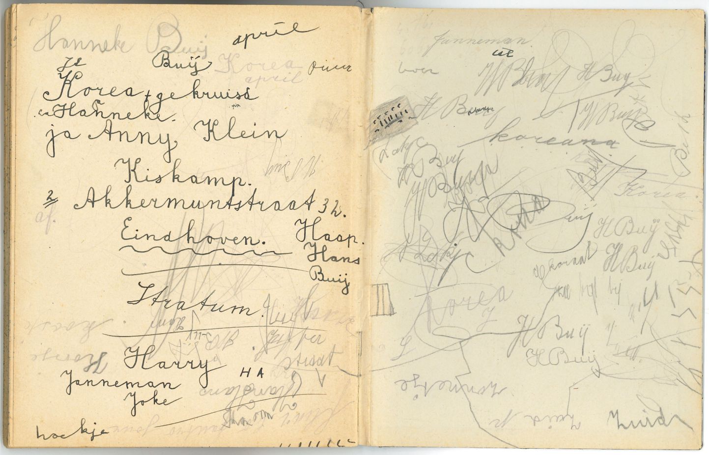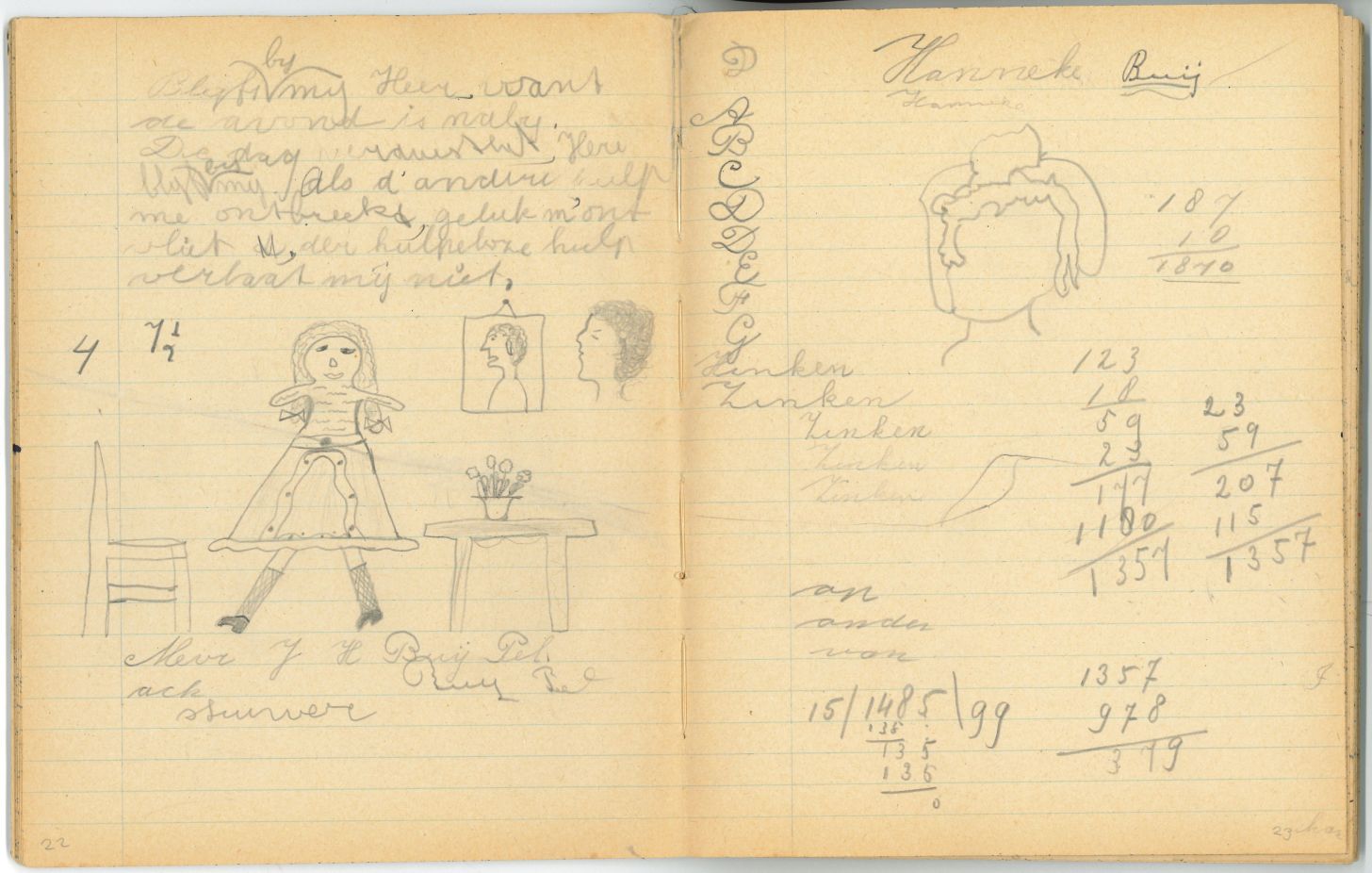 Schrift met tekeningen, aantekeningen en protestantse beloningsplaatjes van de zondagsschool en de lagere school. In het schrift waren bij het in ontvangst nemen allemaal losse briefjes aangebracht met aantekeningen en overgeschreven versjes: p. 3 op de onderste helft stond de aantekening: "Janneman: 26 febr. Geb. 1946, is 2 jaar oud" p. 6 in het midden ...