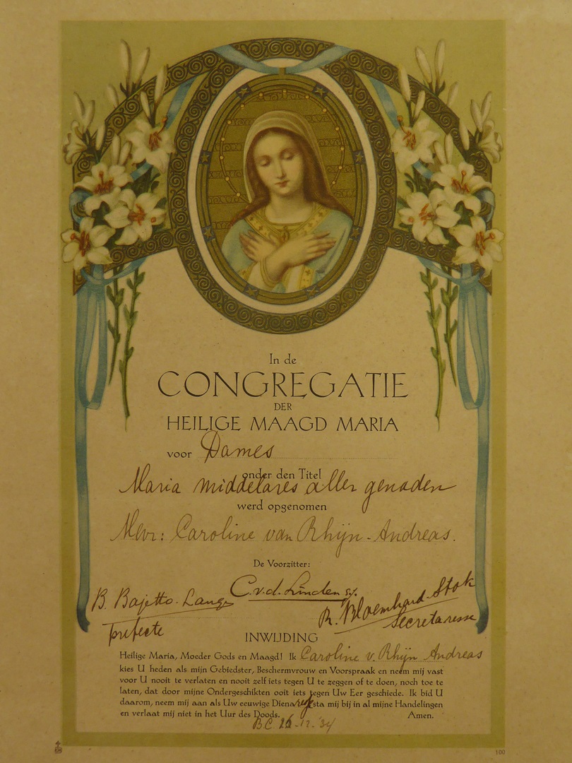 Getuigschrift aanname in de Congregatie der H. Maagd Maria, van Caroline van Rhijn-Andreas