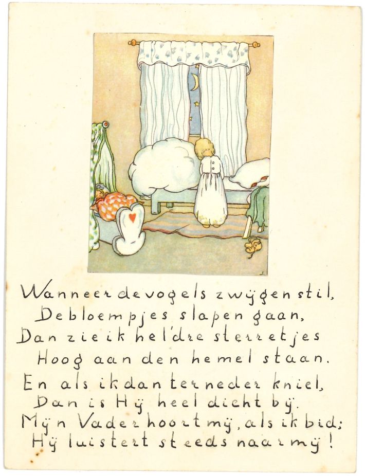 Plaatje: Meisje knielt in gebed bij haar bed in haar slaapkamer. Links een poppenwieg met pop. Vers: Wanneer de vogels zwijgen stil, De bloempjes slapen gaan, Dan zie ik hel’dre sterretjes Hoog aan den hemel staan. En als ik dan ter neder kniel, Dan is Hij heel dicht bij. Mijn Vader hoort mij, als ik ...