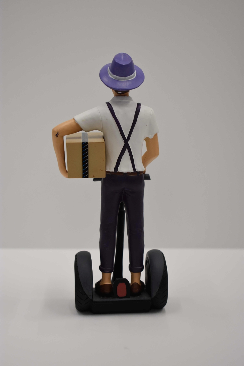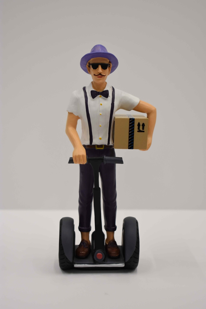 Hipster kerstgroep: één van de drie koningen, met wit overhemd en Amazon Prime pakket onder linkerarm, staand op Segway