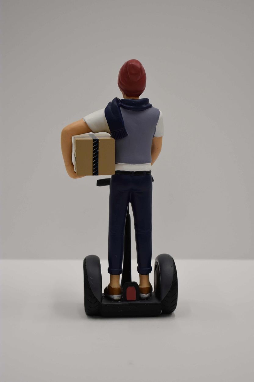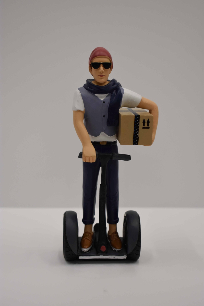 Hipster kerstgroep: één van de drie koningen, met paarse gilet en Amazon Prime pakket onder linkerarm, staand op Segway