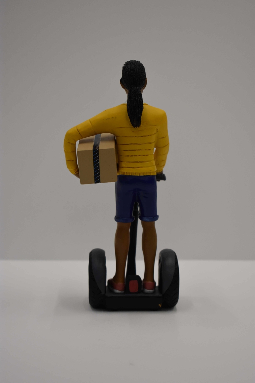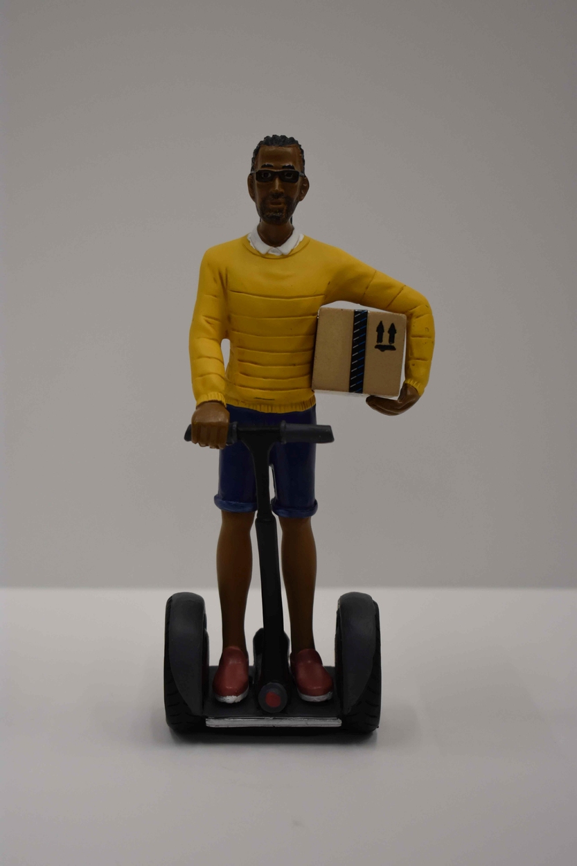 Hipster kerstgroep: één van de driekoningen, met gele trui en Amazon Prime pakket onder linkerarm, staand op Segway