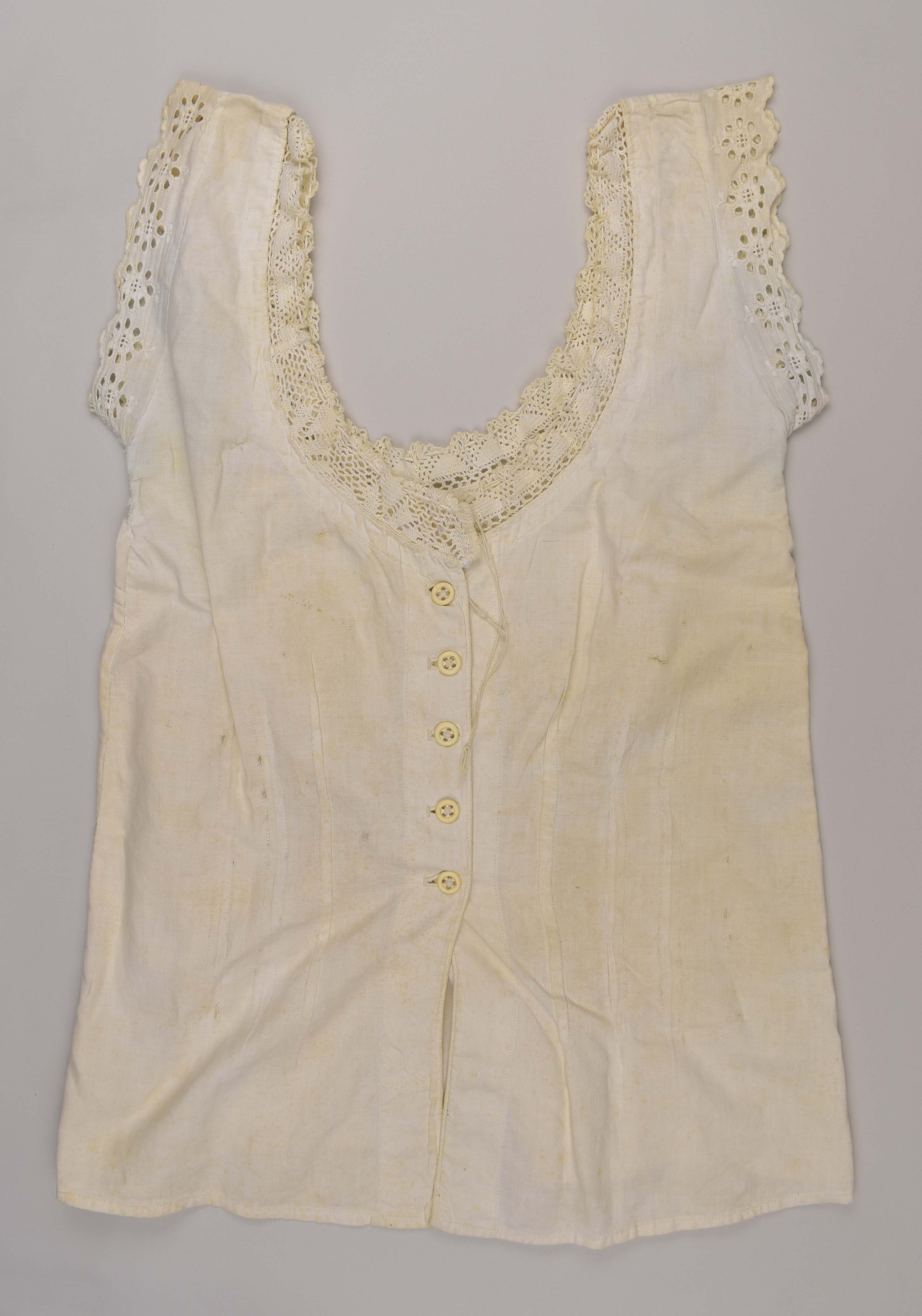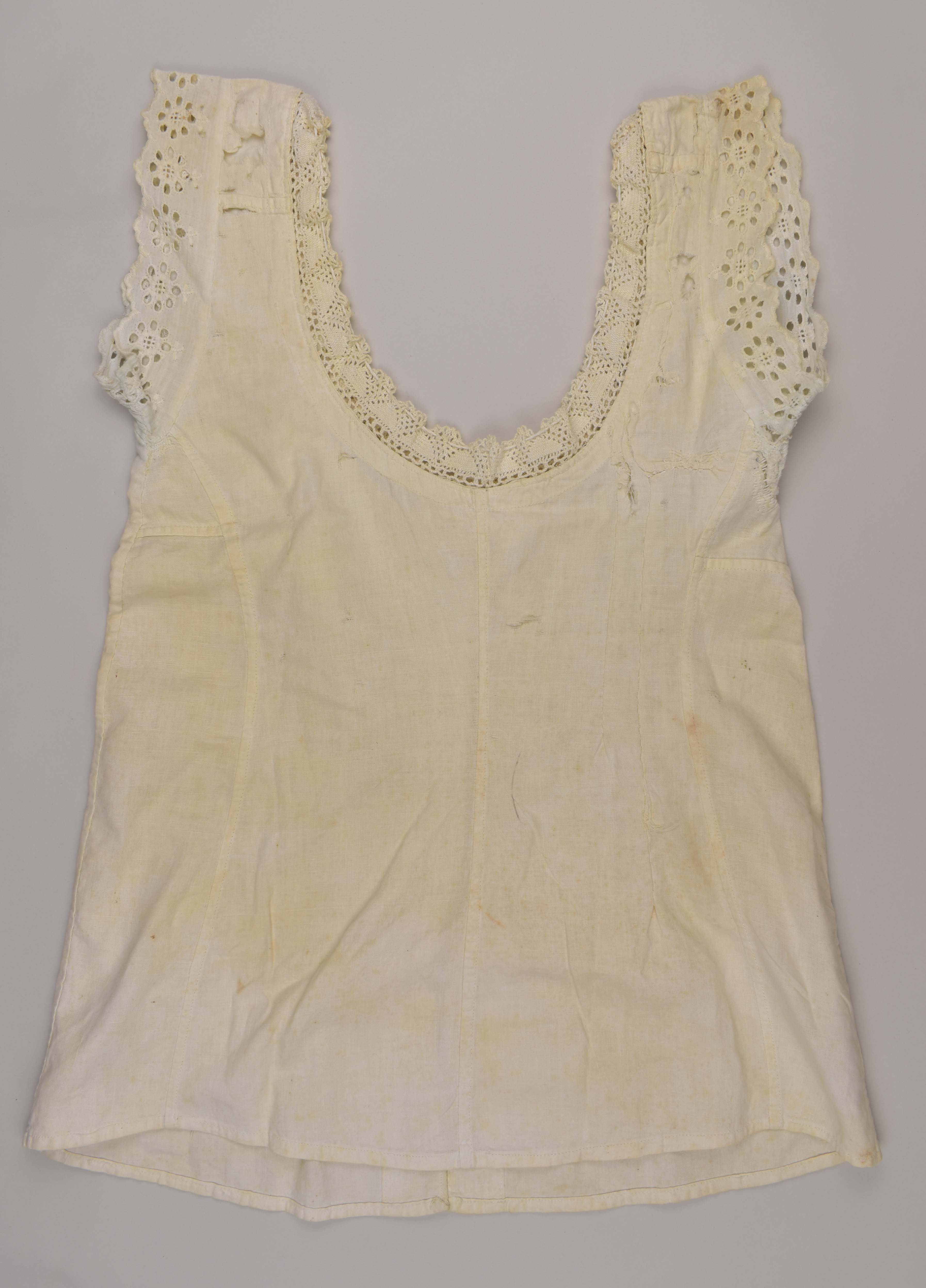 Wit onderhemd afgezet met kantranden, waarin de piring natzar was verpakt tijdens de reis naar van Indonesië naar Nederland in 1951
