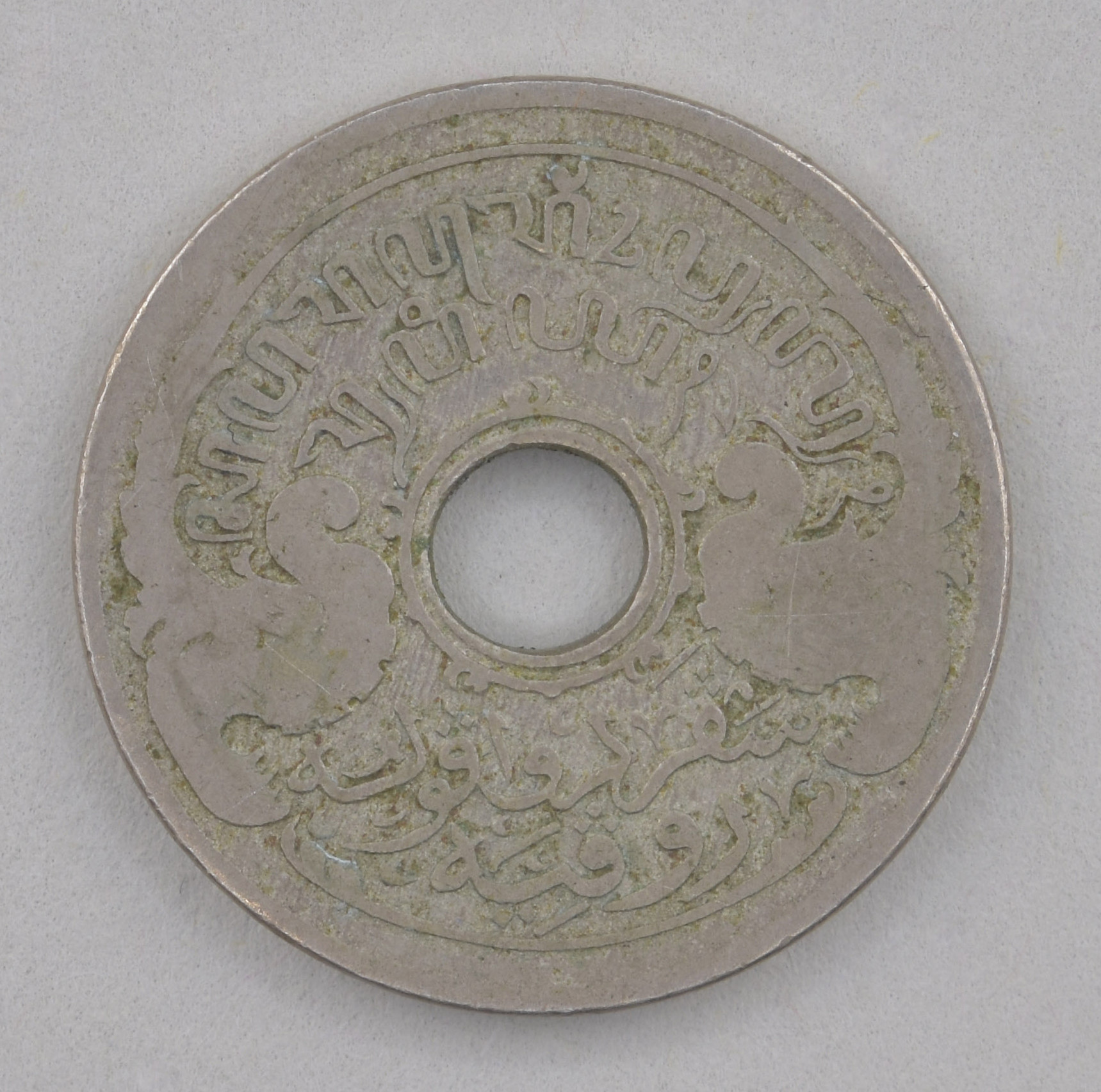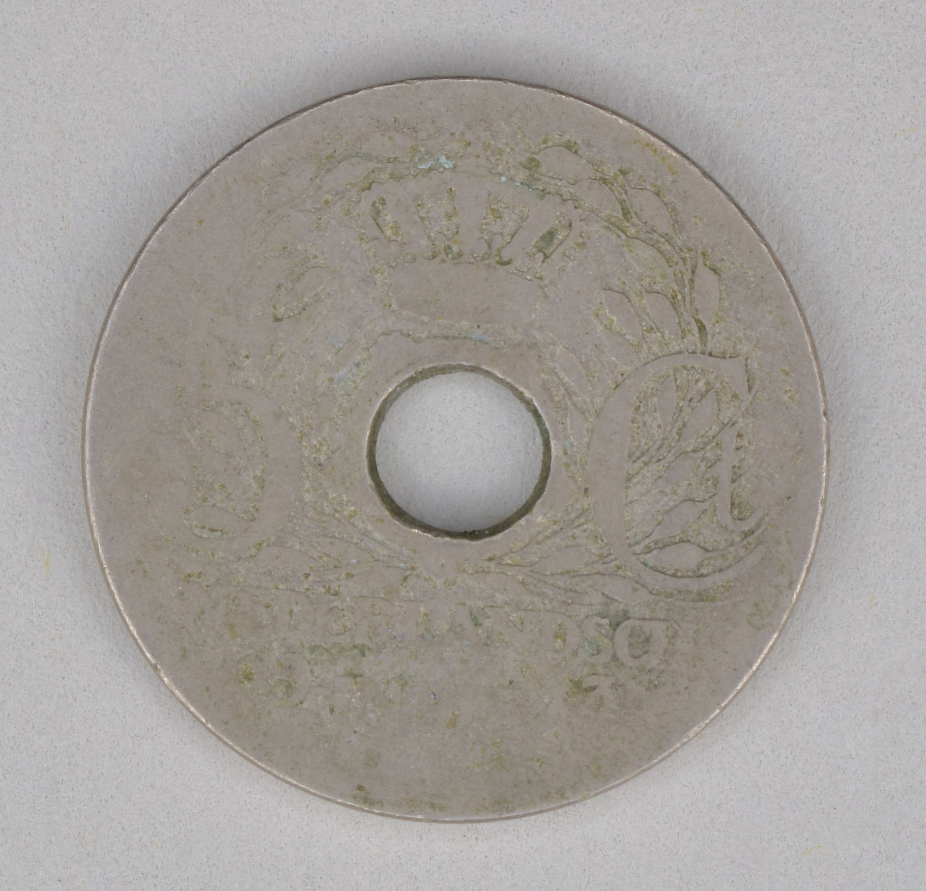 Natzar, munten als offergave behorend bij piring: vijf cent Nederlands-Indië, met gat, met kroon en jaartal, kz. waarde-aanduiding in het Maleis en Javaans