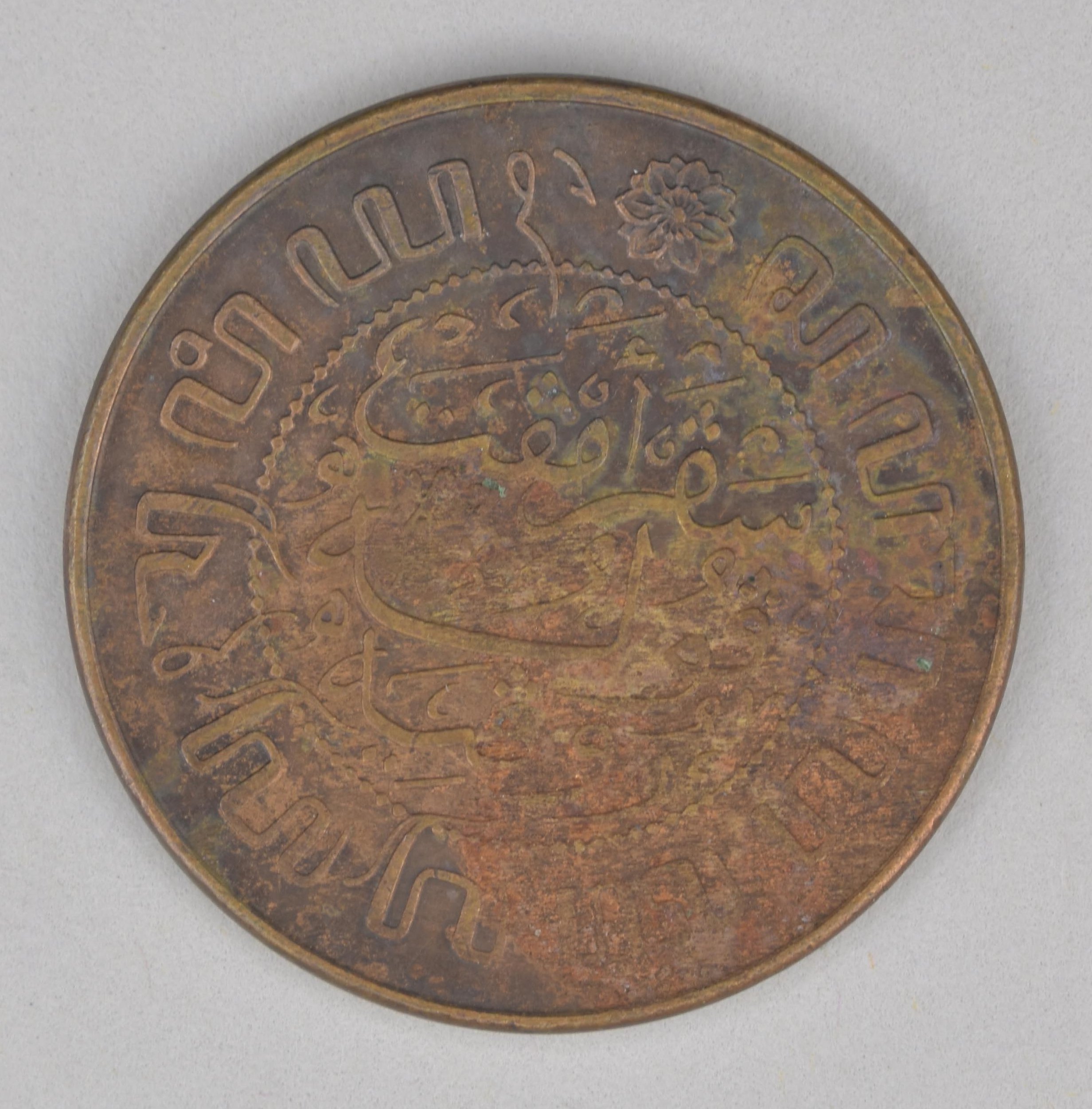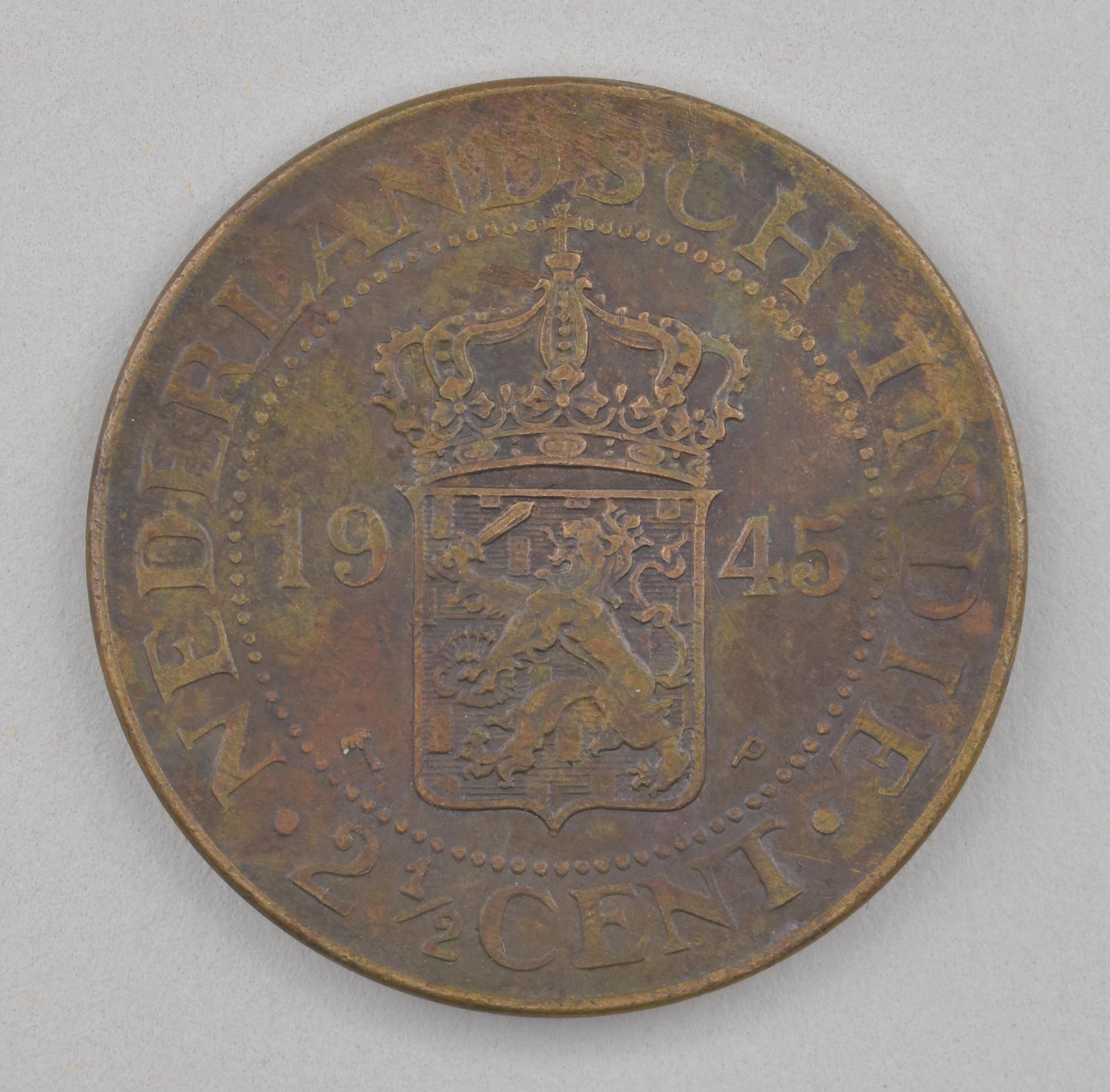 Natzar, munten als offergave behorend bij piring: twee en een halve cent Nederlands-Indië met gekroond Nederlands wapenschild tussen jaartal, kz. waarde-aanduiding in het Maleis en Javaans