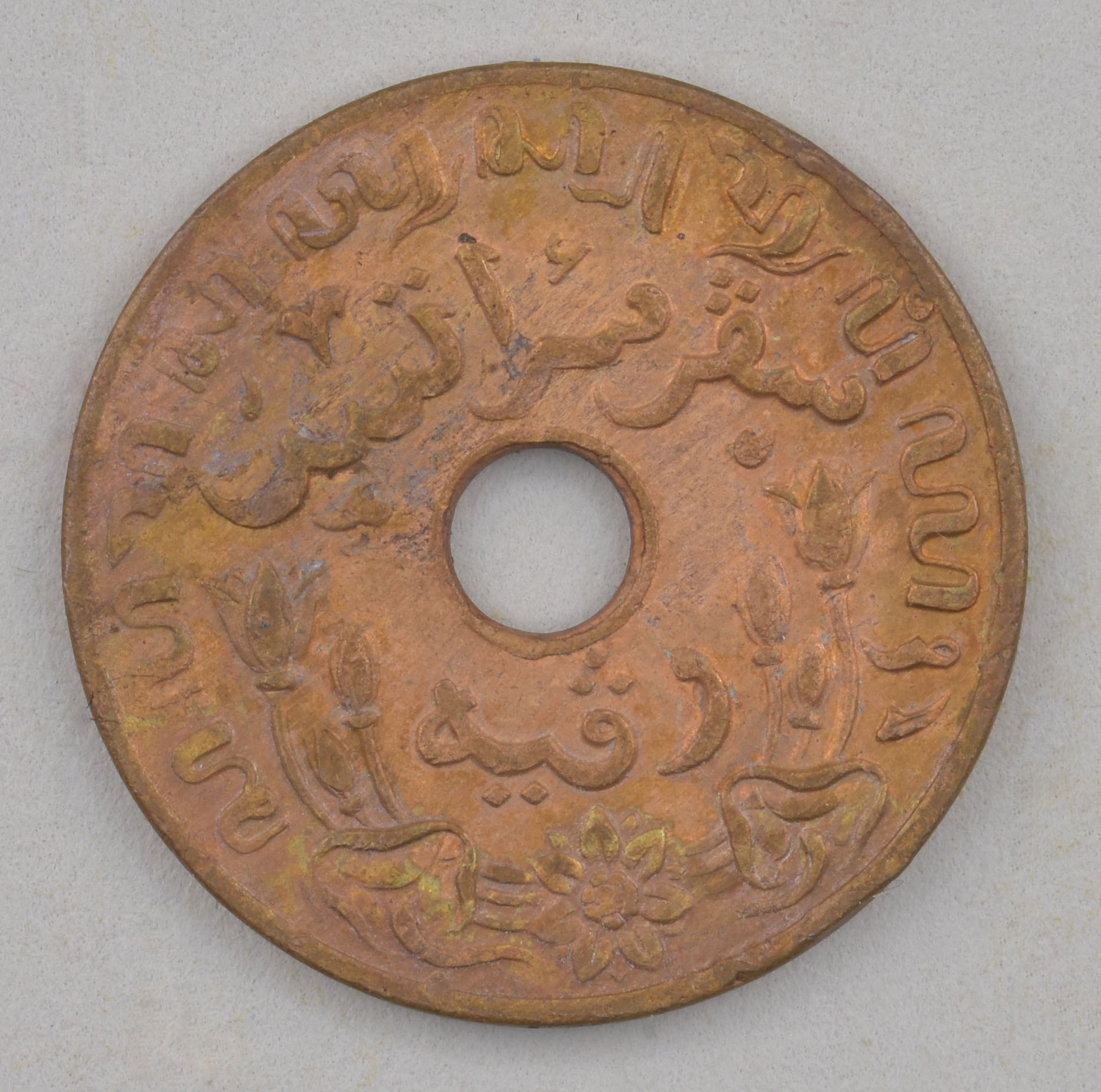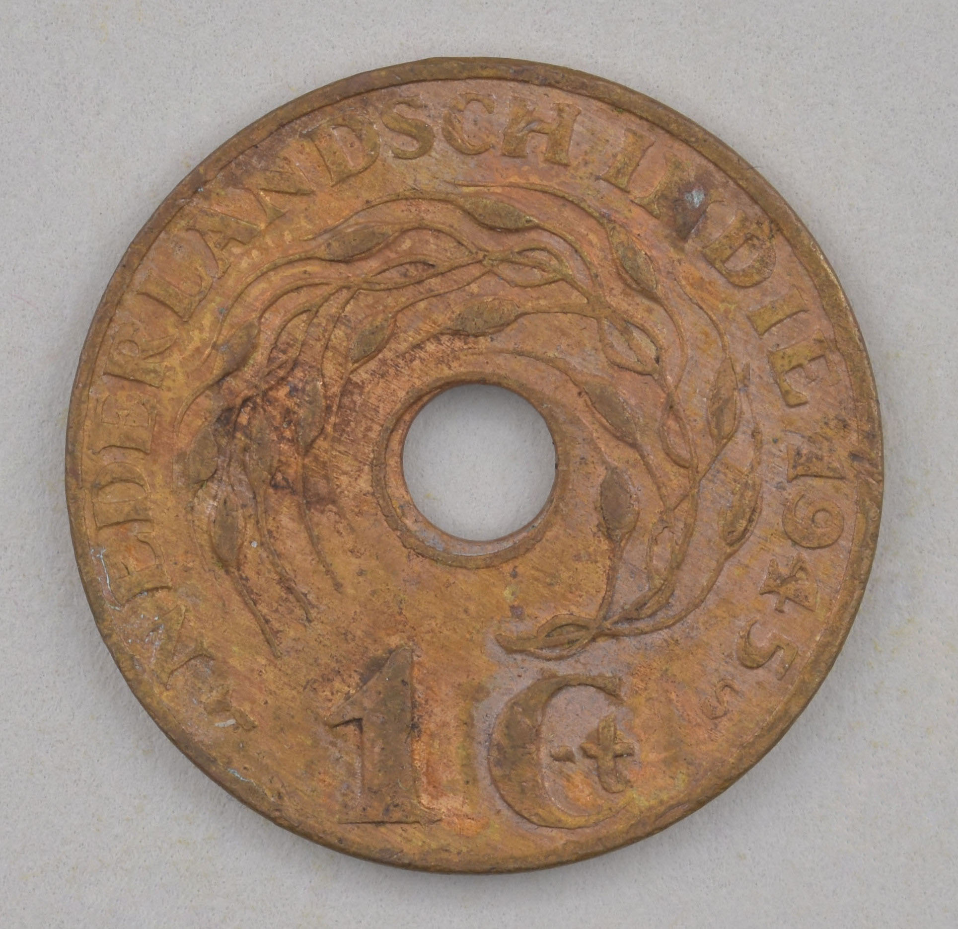 Natzar, munten als offergave behorend bij piring: 1 cent Nederlands-Indië, met gat, kz. waarde-aanduiding in het Maleis en Javaans