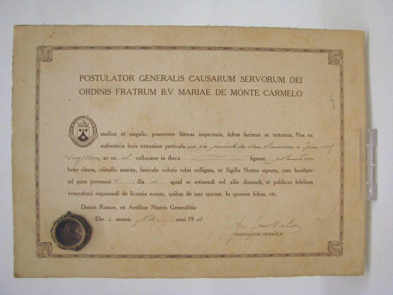 Reliek H. Theresia in medaillon met brief van authenticiteit
