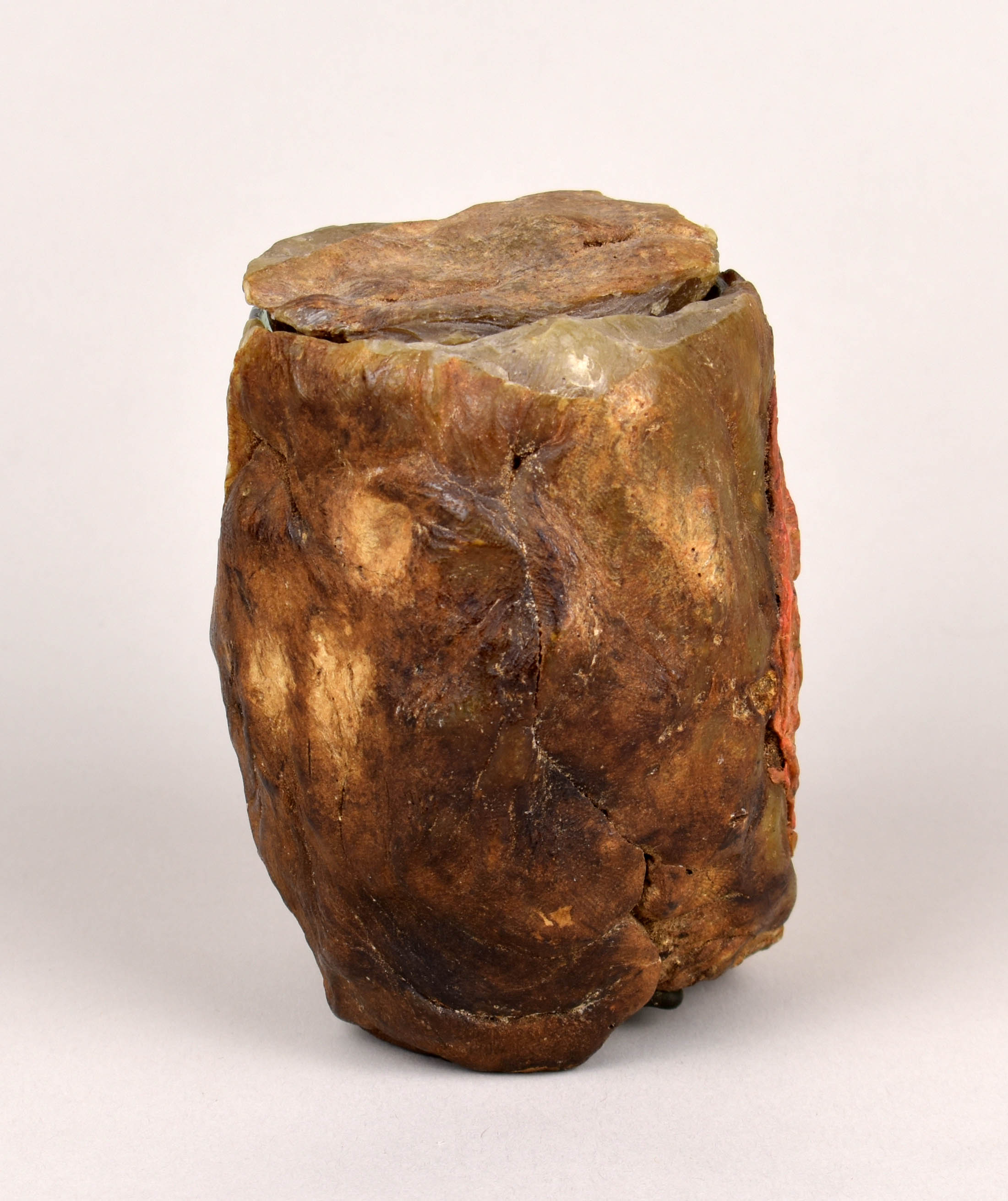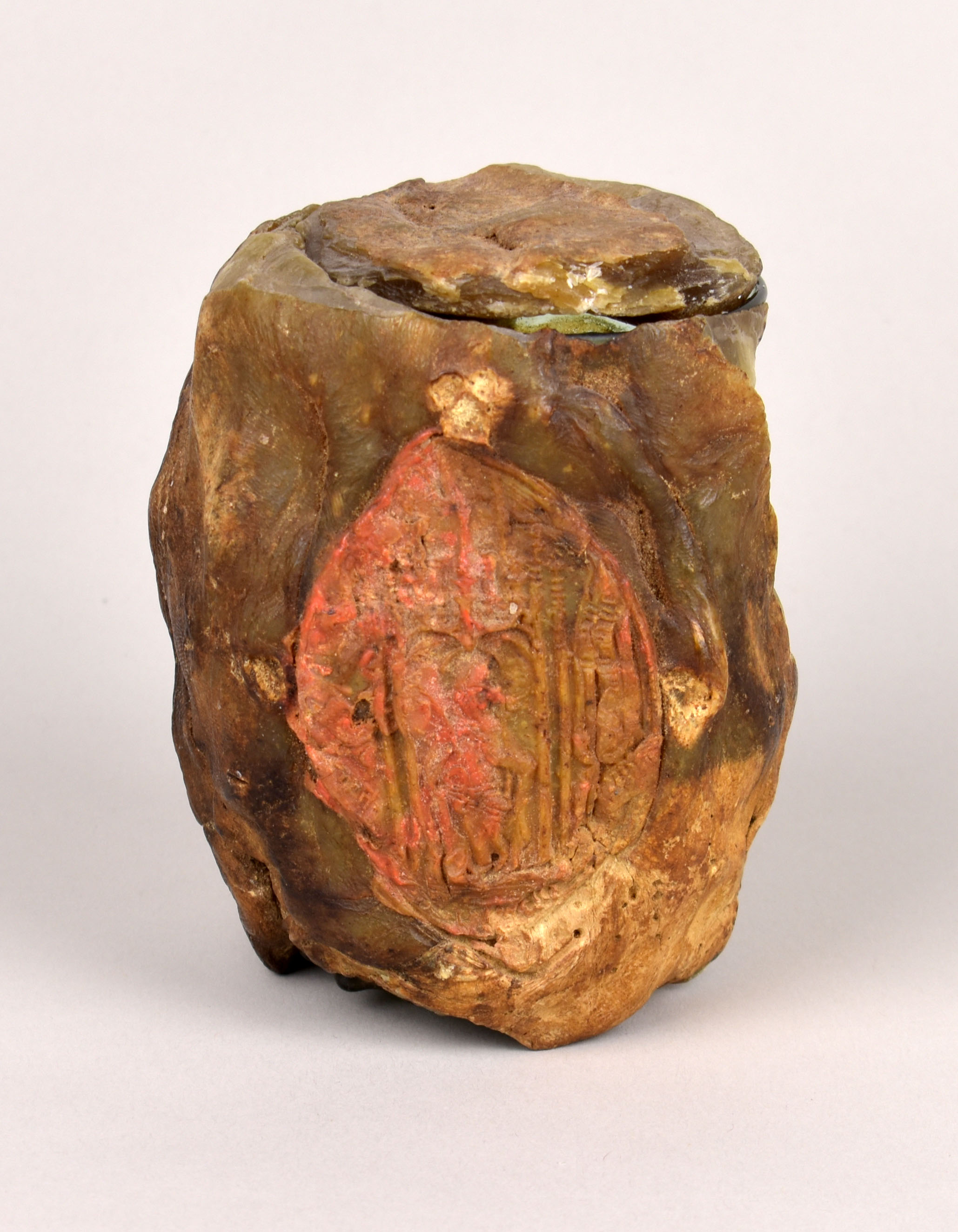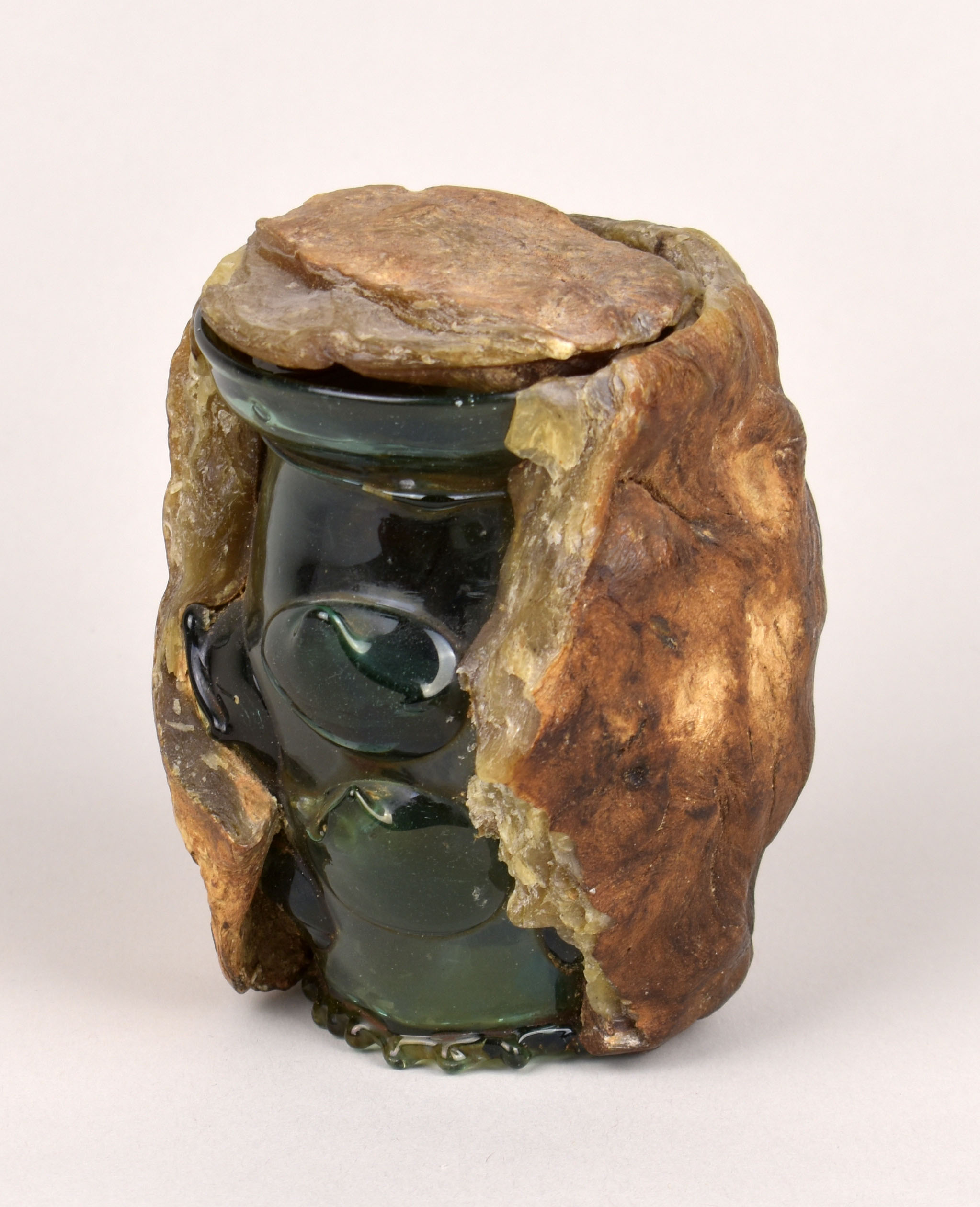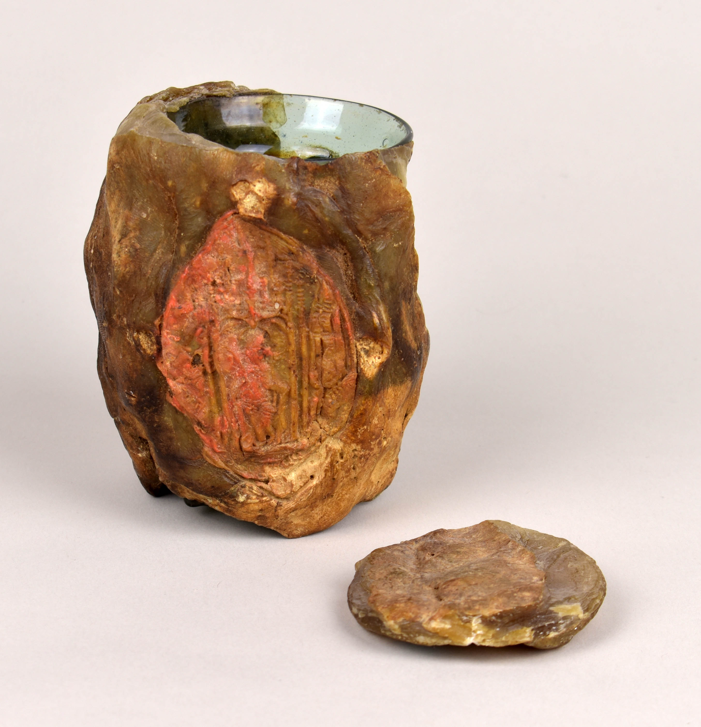 Blauwgroen reliekglas (Krautstrunk/koolstronk) bekleed met was met zegel van wijbisschop Reichard (1481-1513), met wassen deksel