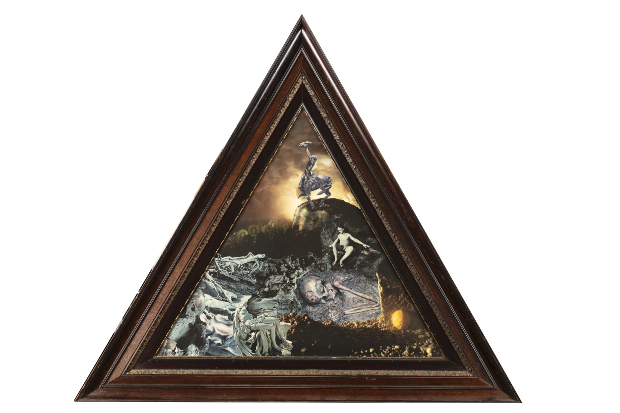 Collage op hout in een driehoekige lijst met voorstelling van een wederopstanding met diverse religieuze motieven, waaronder een piëta en vanitas. Fruit verbeeldt onder andere de vruchtbaarheid. Ook afgebeeld zijn grafstenen en een man in een modderpoel.