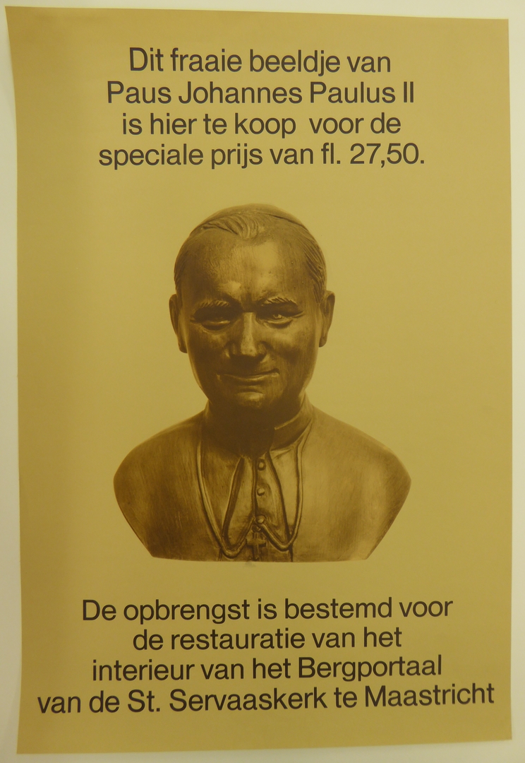 Affiche met "Dit fraaie beeldje van Paus Johannes Paulus II is hier te koop ... bestemd voor de restauratie ... St. Servaaskerk te Maastricht"