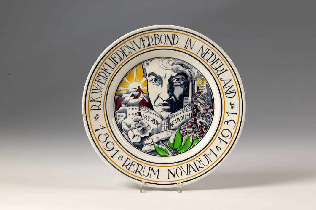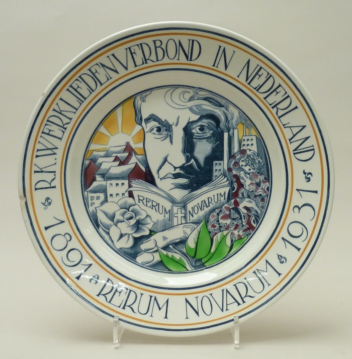Wandbord veertig jaar Rerum Novarum (1891-1931) met mannenhoofd en "R.K. Werklieden-Verbond"