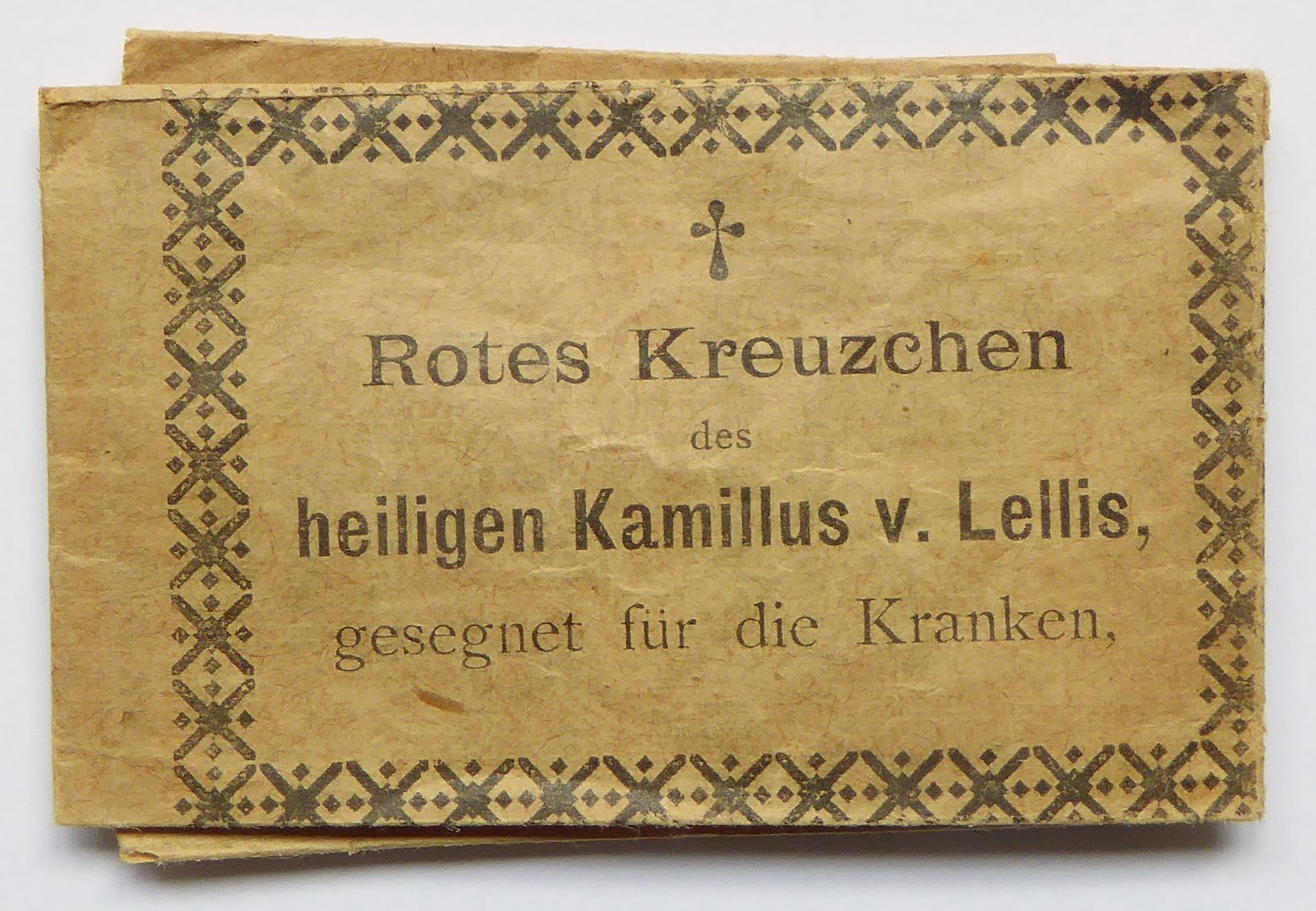 Rood kruisje voor zieken, gezegend door H. Kamillus (Camillus) van Lellis, in papieren wikkel
