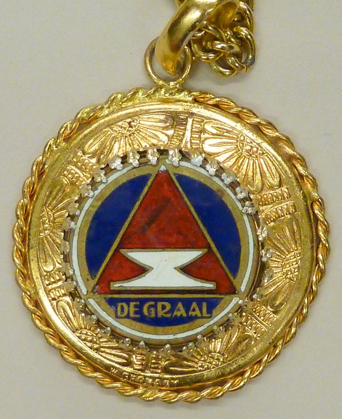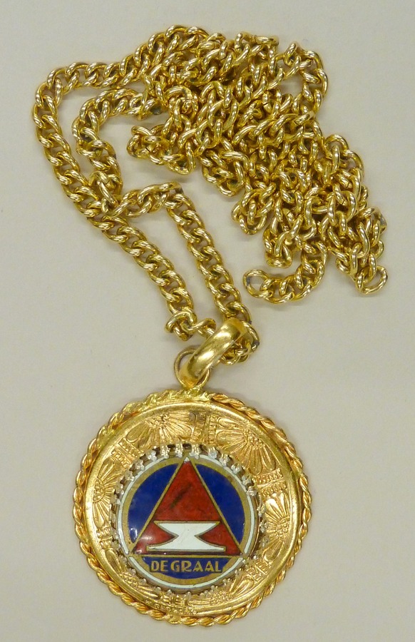 Halsketting van vereniging 'De Graal' met witte schaal in rode driehoek