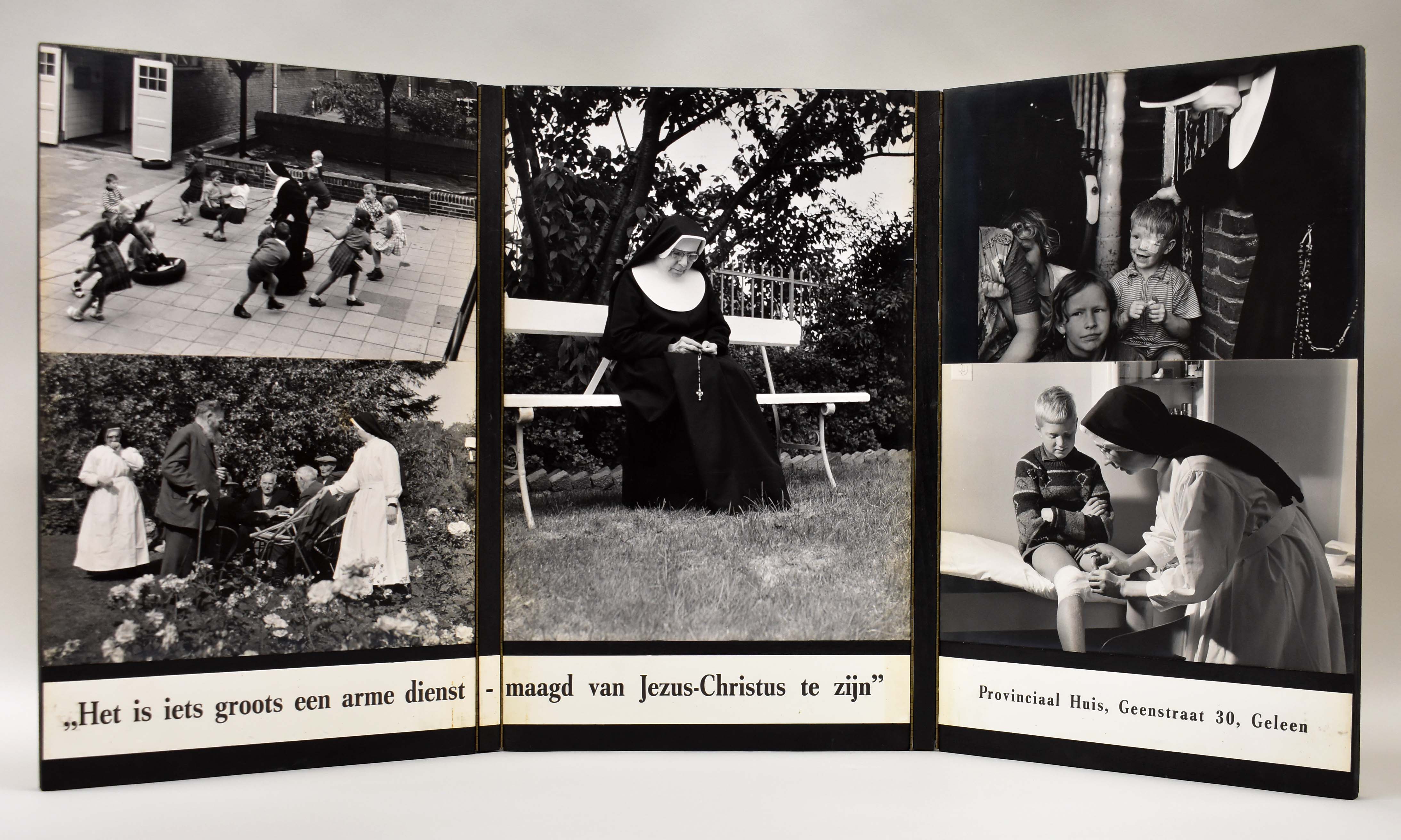 Fotocollage op drieluik met verschillende taken van nonnen en tekst