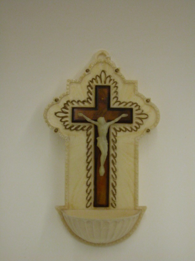 Wijwaterbakje met fluoricerend kruisbeeldje op drielobbig achterschot