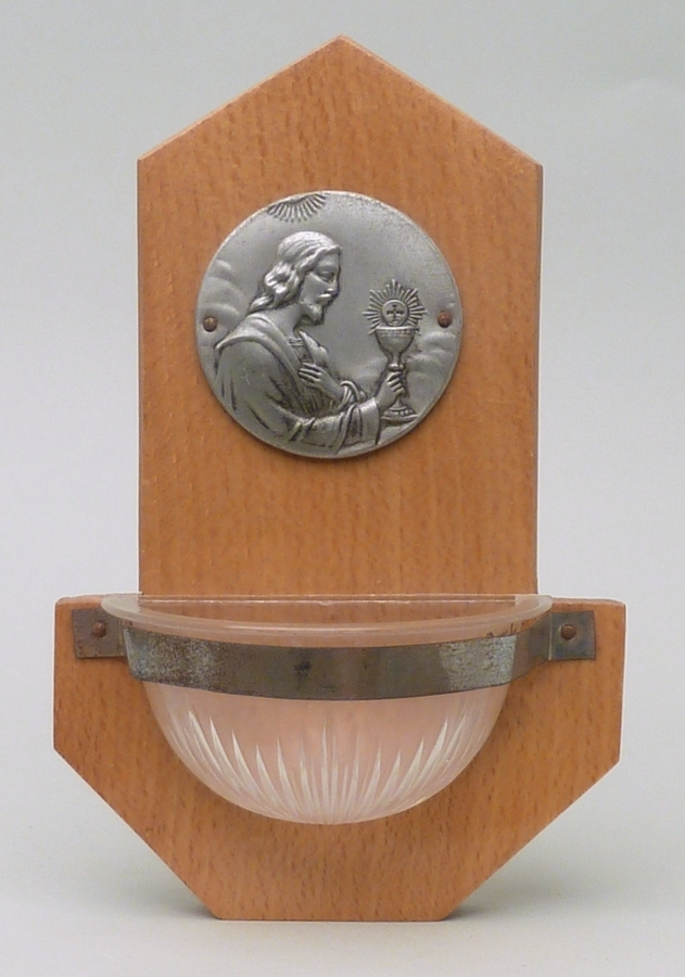 Wijwaterbakje met borstbeeld van Christus en profiel