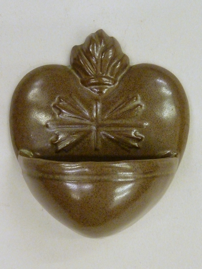 Wijwaterbakje in vorm brandend hart waarin kruis