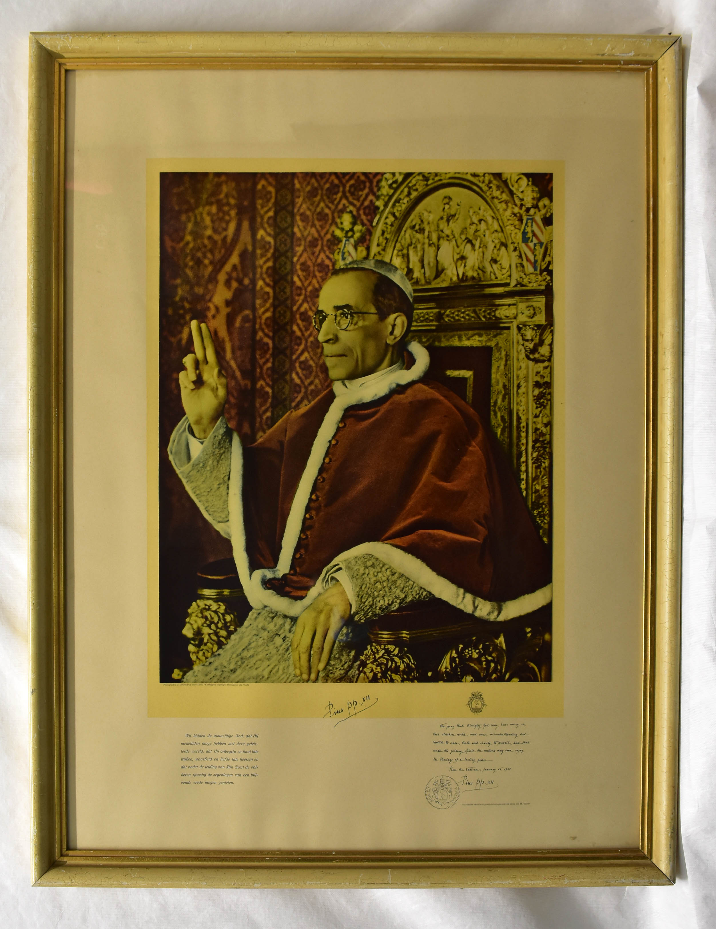 Kleurenreproductie van zegenende paus Pius XII met gebed