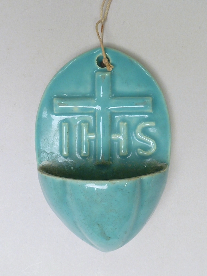 Lichtblauw wijwaterbakje met op achterschot IHS en kruis