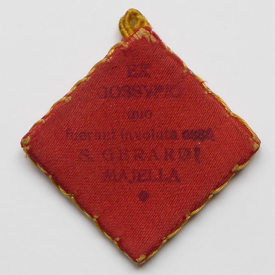 Aanrakingsreliek: bestempeld satijn op karton "S. Gerarde Majella"