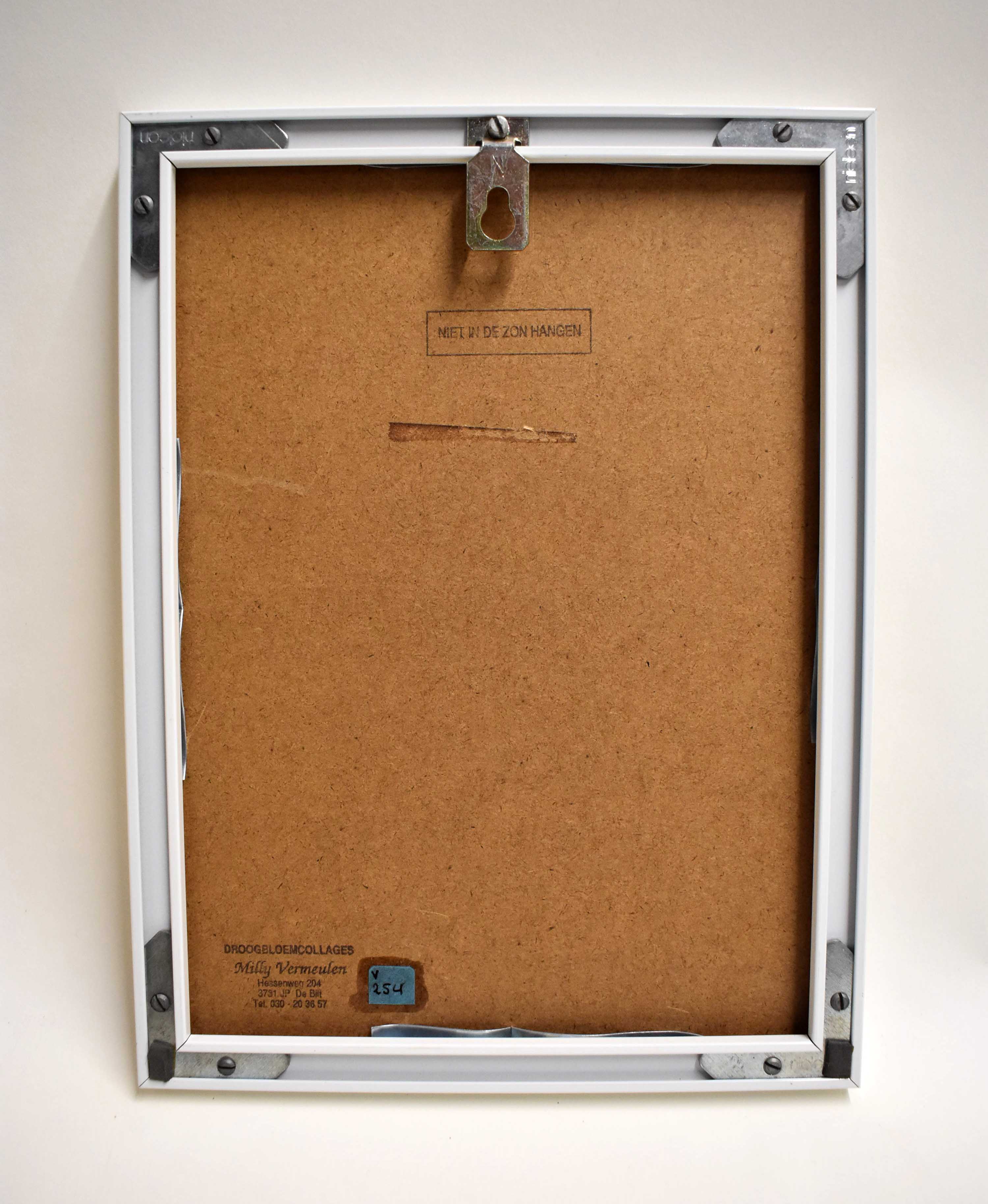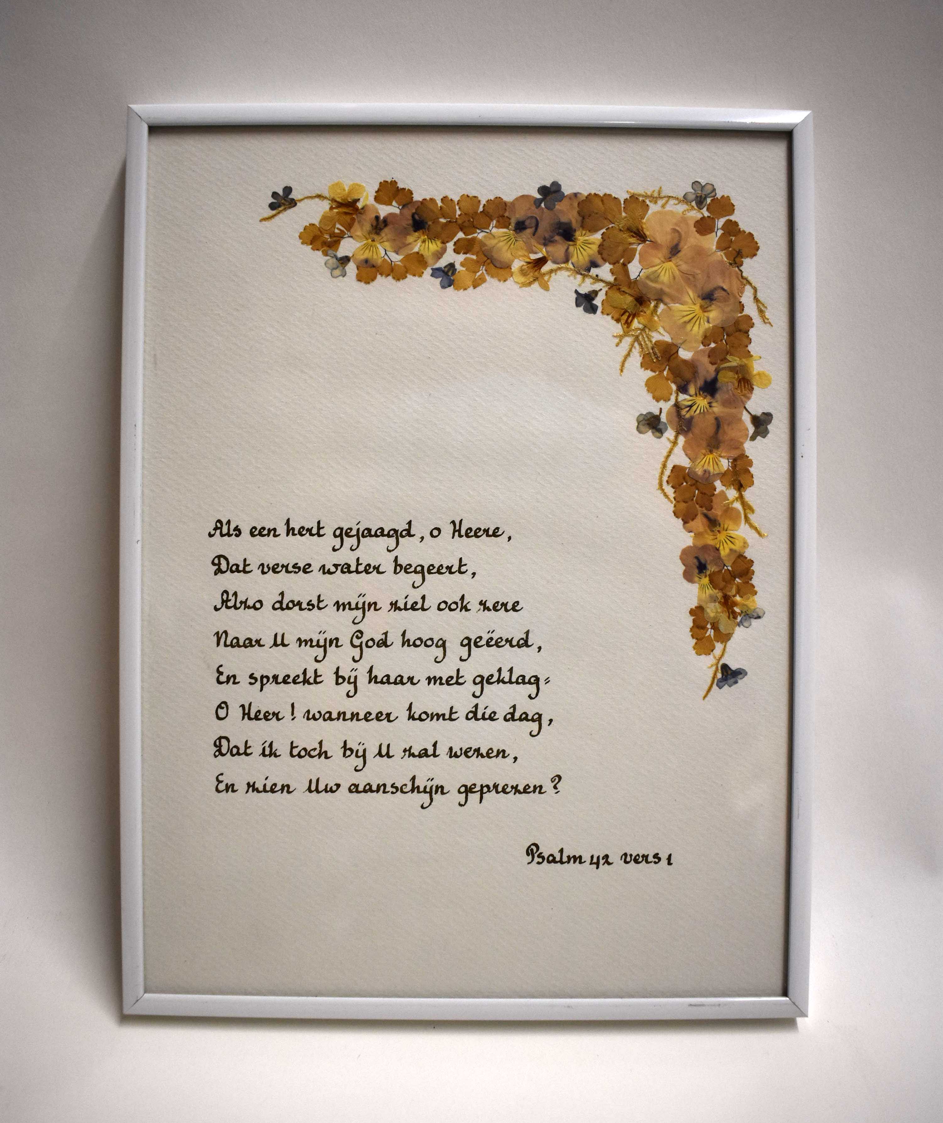 Psalmtekst 42:1 in lijst, naar berijming Petrus Datheen, gedecoreerd met droogbloemen