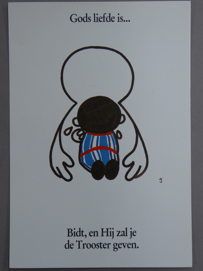 Prentbriefkaart met "Gods liefde is ... Bidt, en Hij zal je de Trooster geven."