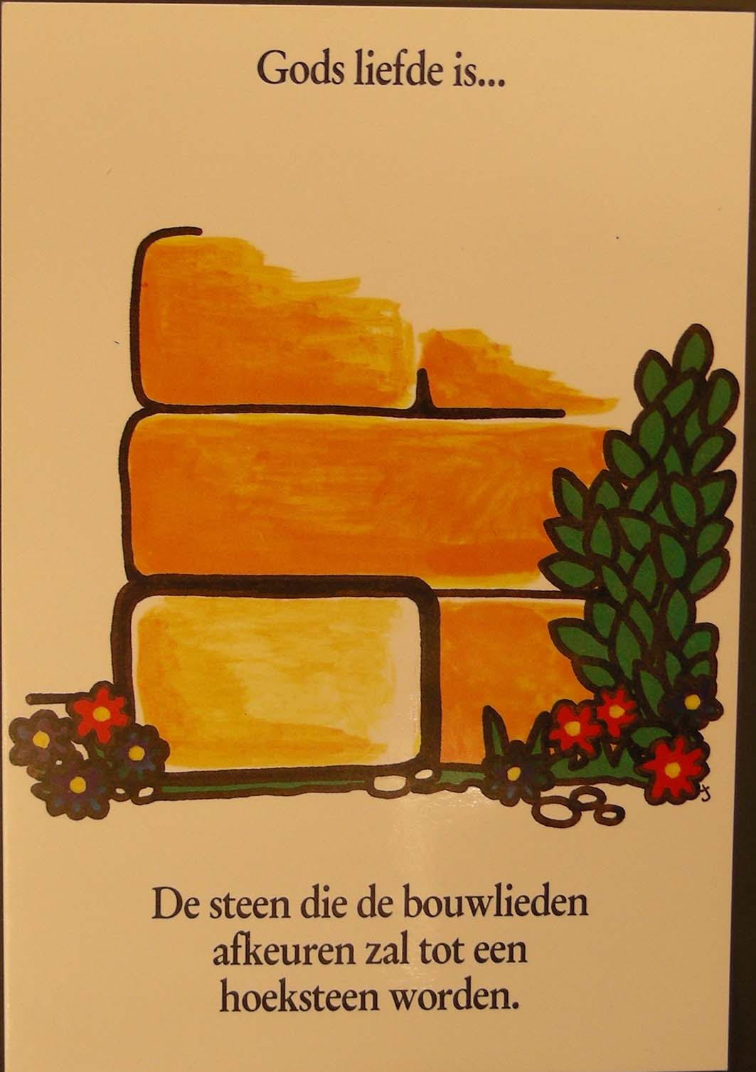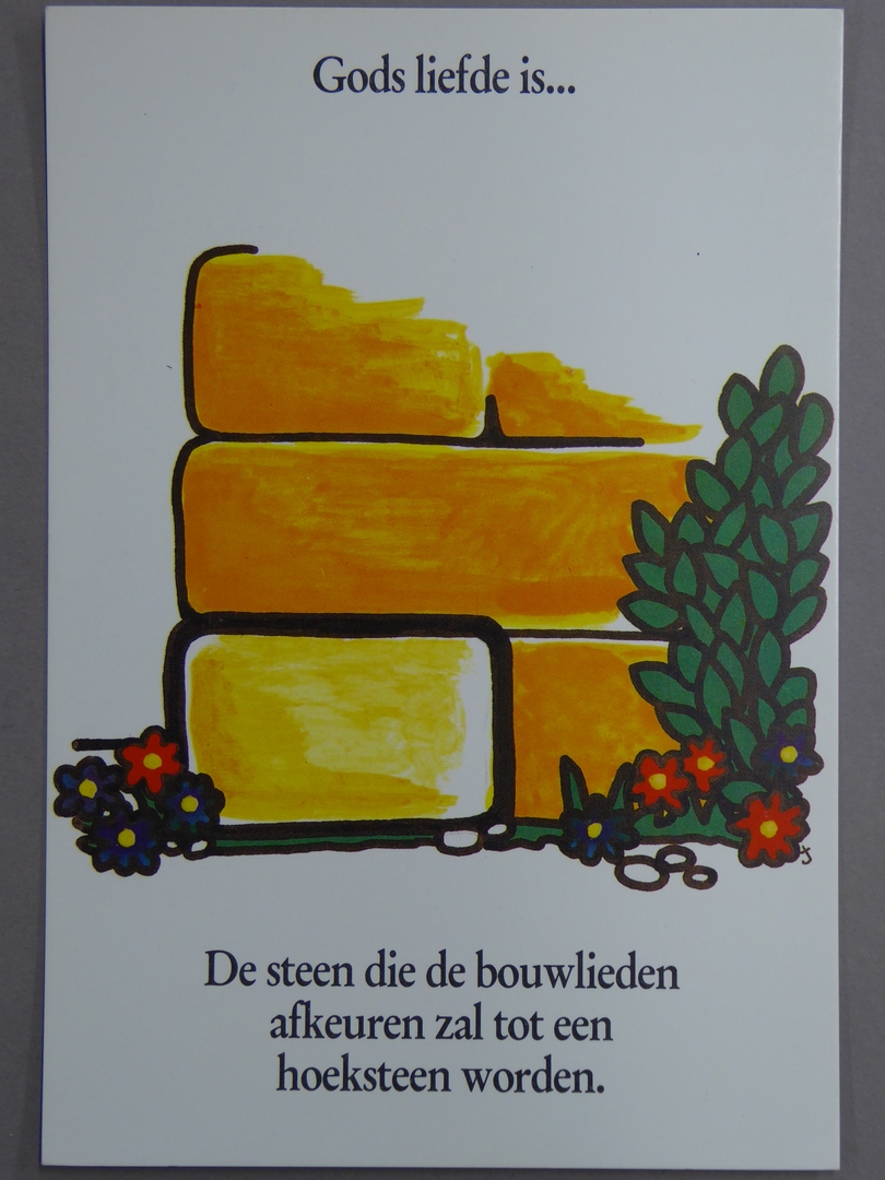 Prentbriefkaart met "Gods liefde is ... De steen die de bouwlieden afkeuren zal tot een hoeksteen worden."