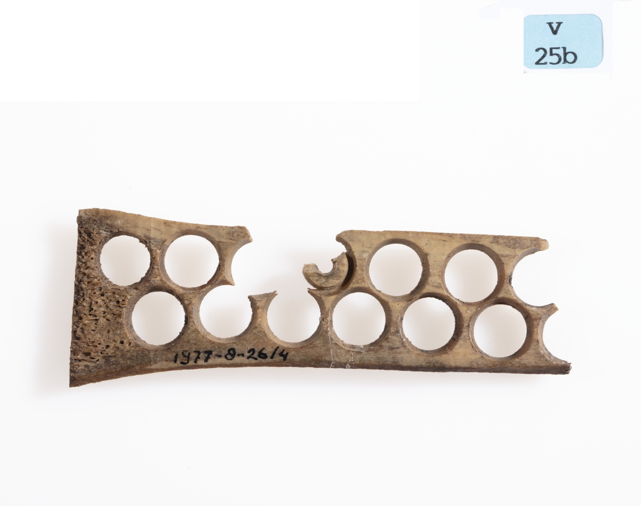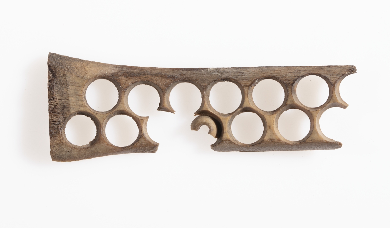 Doorboord stukje bot met stukje uitgeboorde kraal, rest vervaardiging rozenkrans kralen