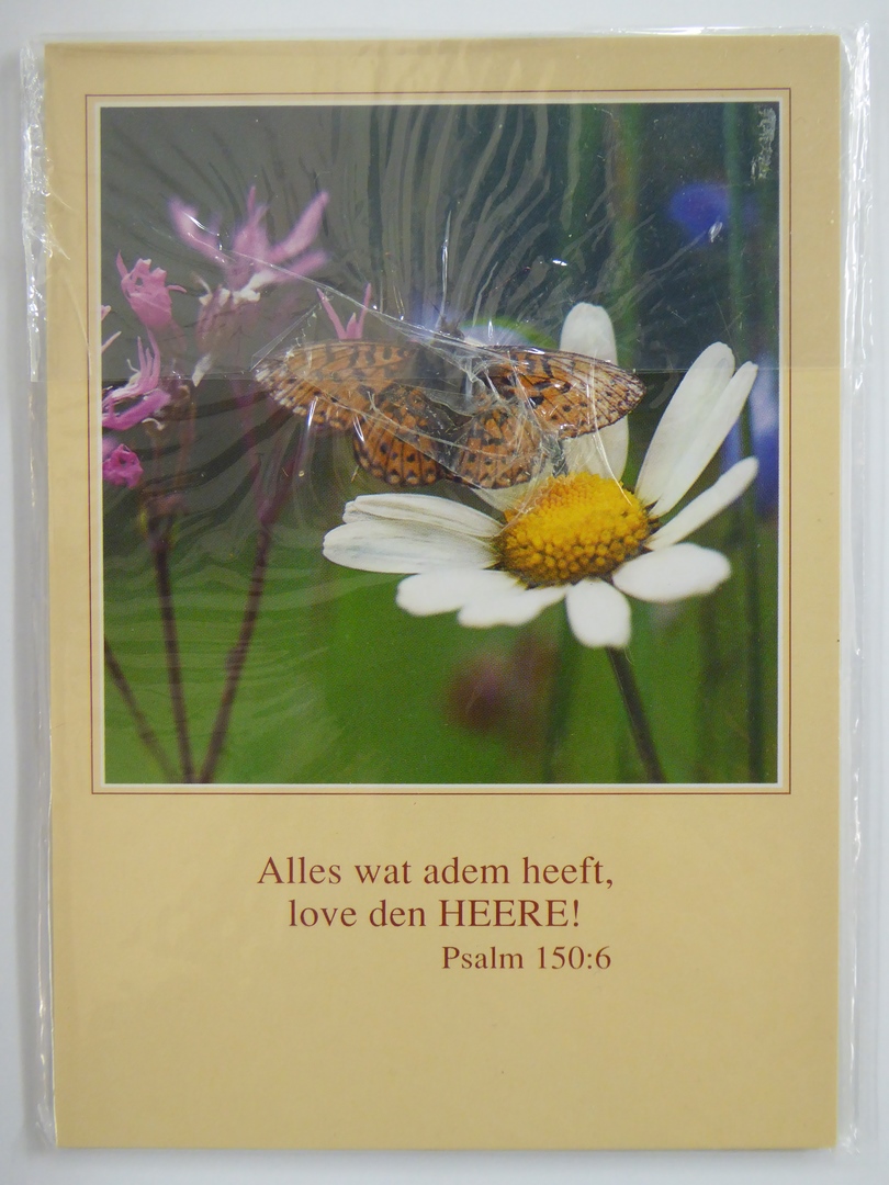Puzzel en prentbriefkaart met vlinder en bijbelteksten, met "Alles wat adem heeft, ..."