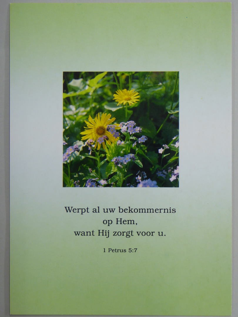 Prentbriefkaart met bloemen en bijbeltekst "Werpt al uw bekommernis op Hem, want Hij zorgt voor u. 1 Petrus 5:7"
