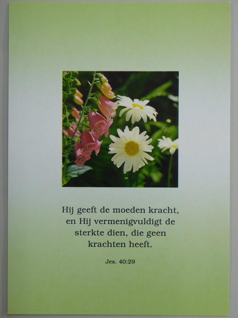 Prentbriefkaart met bloemen en bijbeltekst "Hij geeft de moeden kracht, en Hij vermenigvuldigt de sterkte dien, die geen krachten heeft. Jes. 40:29"