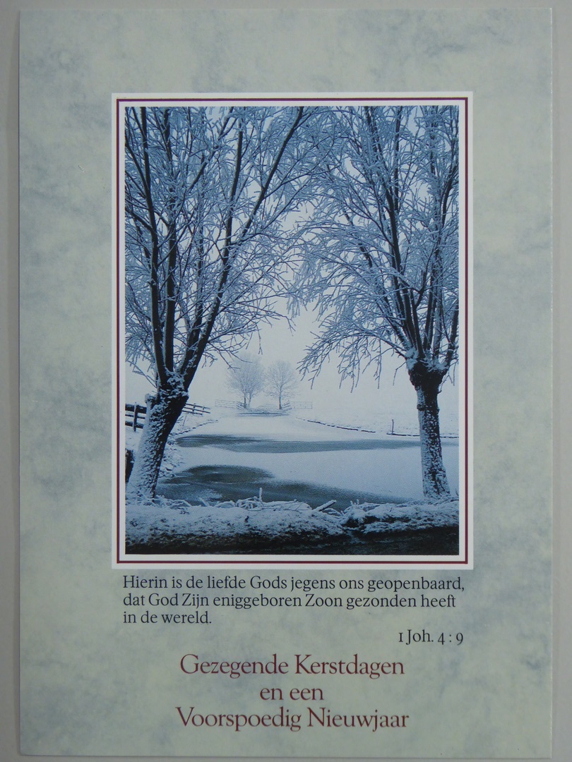 Kerst- en nieuwjaarskaart met winterlandschap en bijbeltekst "Hierin is de liefde Gods jegens ons geopenbaard, ..."