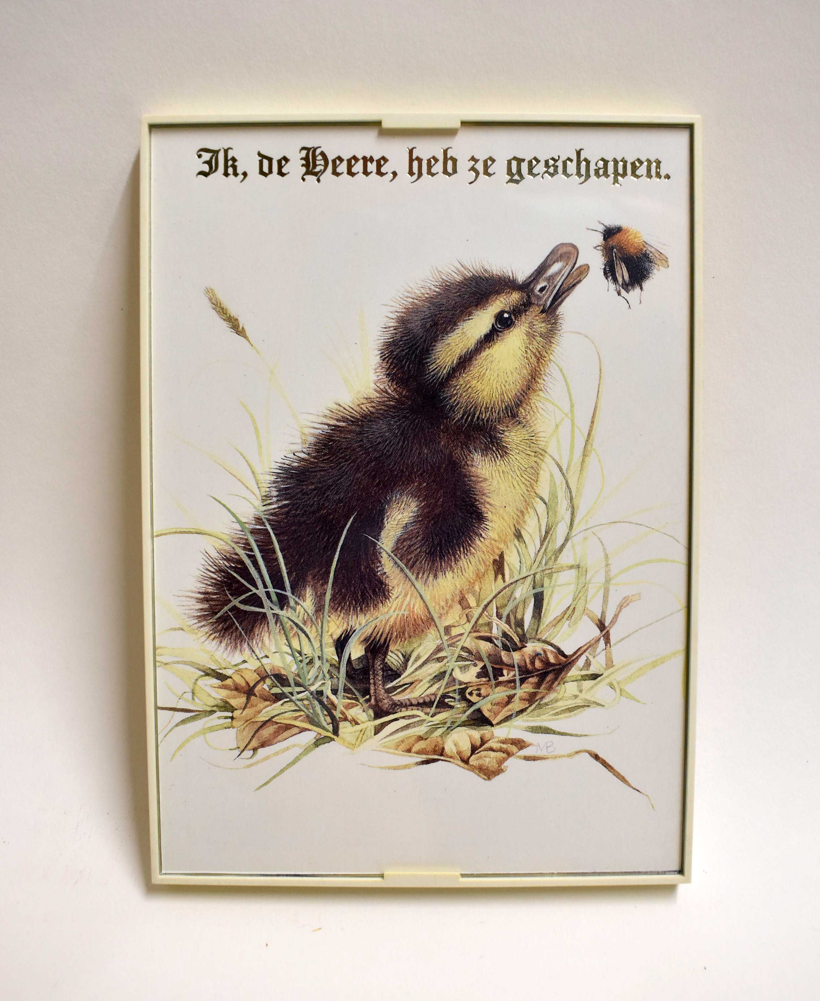 Prentbriefkaart in lijst met kuiken en "Ik, de Heere, heb ze geschapen."