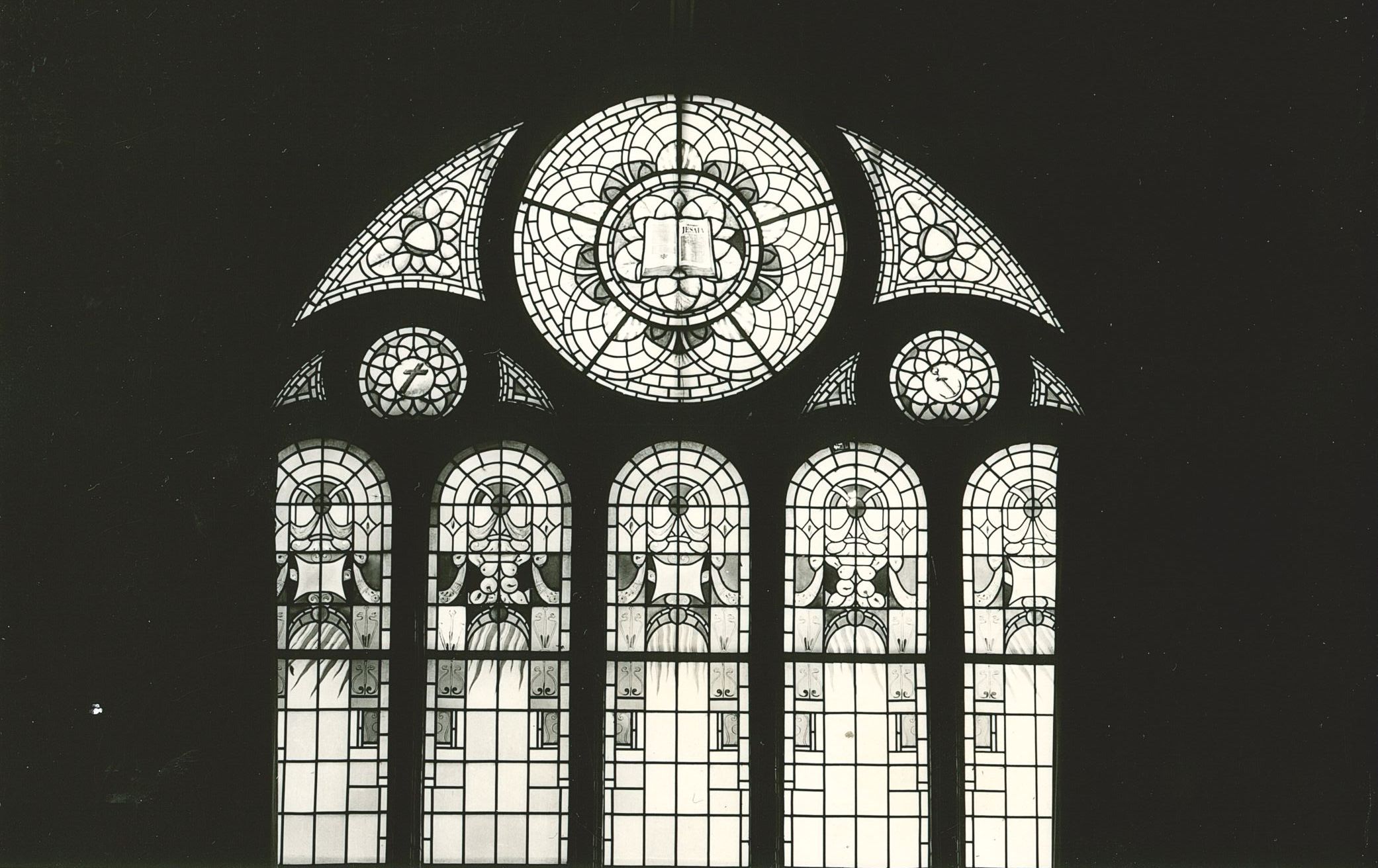 Fragment glas-in-lood raam uit Remonstrantse Kerk op Laan 20 te Den Haag: rond raam met boek met "Jesaia"