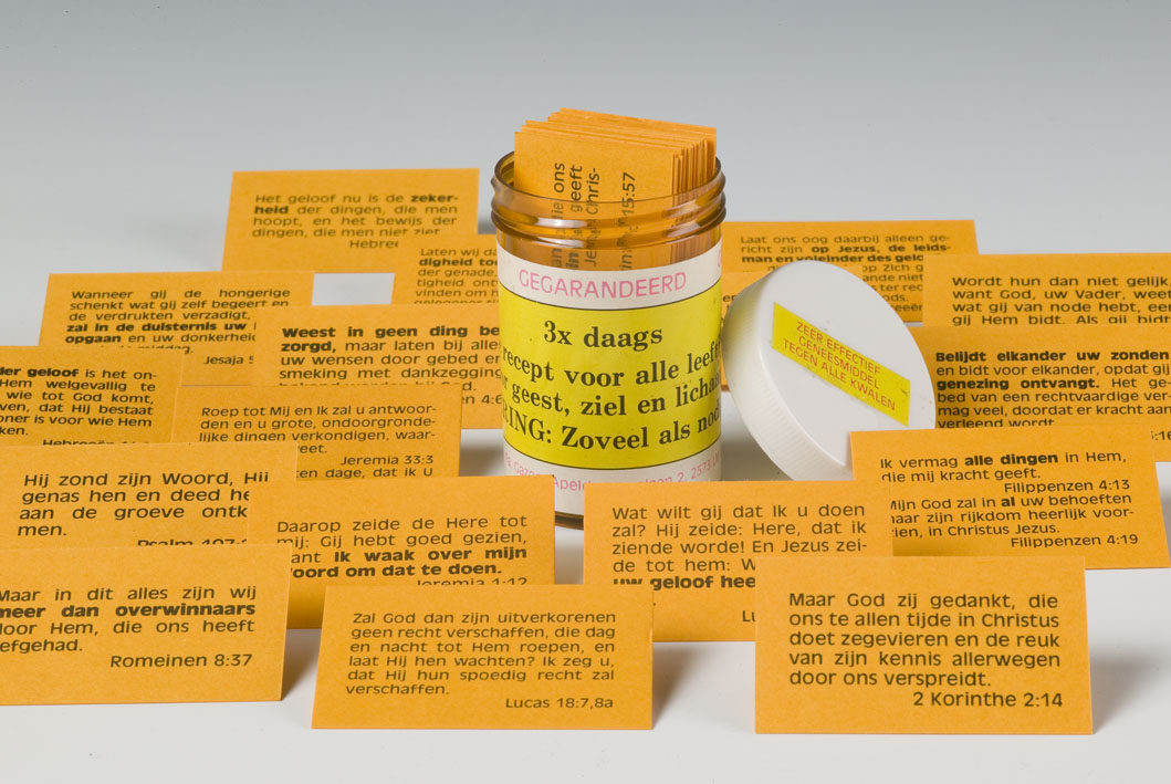 Medicijnpotje met bijbelteksten en "Beste recepten voor alle leeftijden"