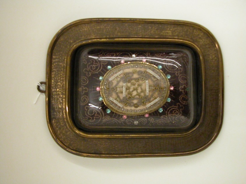 Reliekhouder in lijst met zes relieken en de namen van de heiligen op strookjes perkament