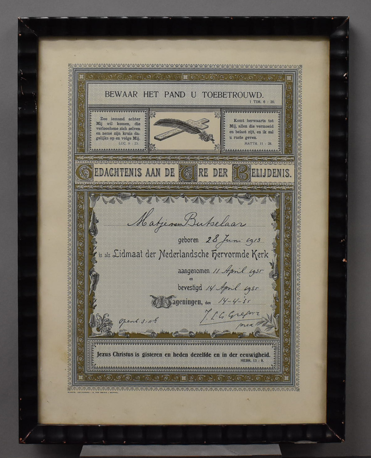 Belijdenisplaat, ingelijst, van Matje van Butselaar