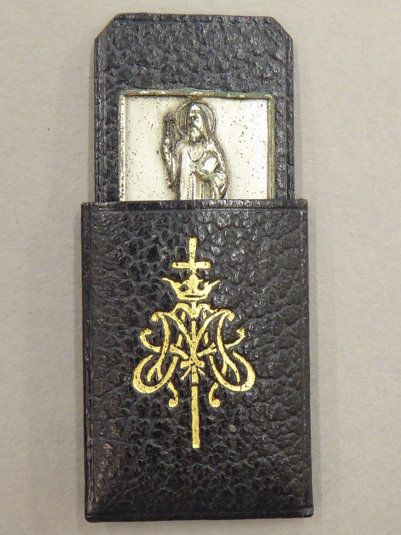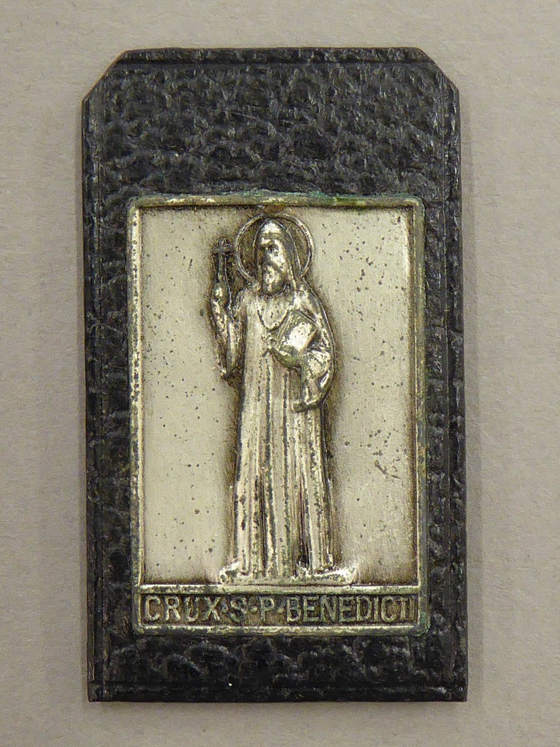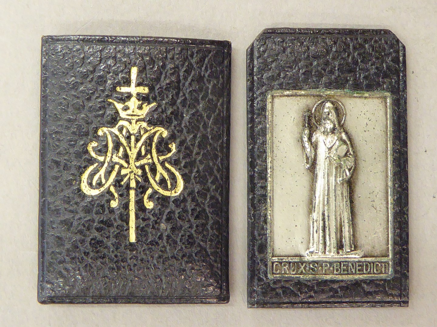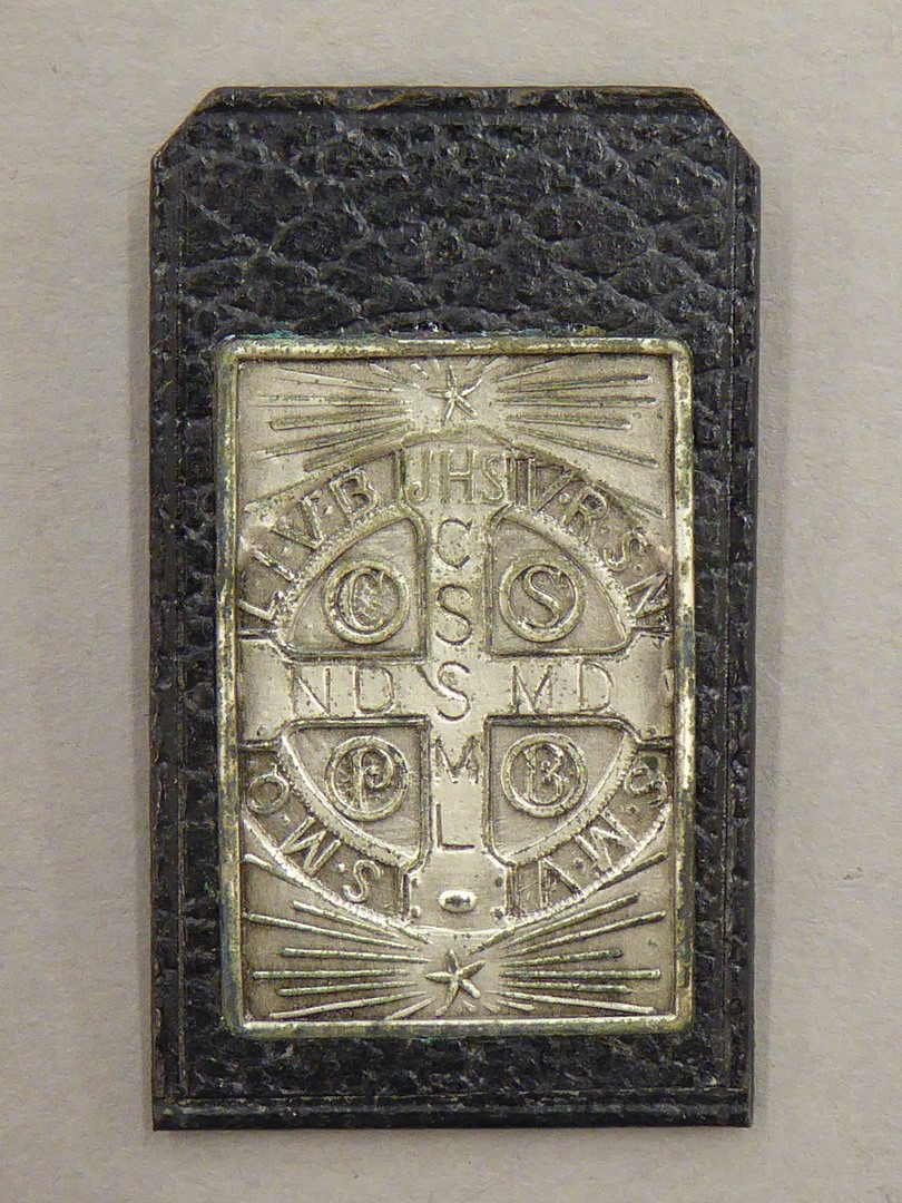 Reliëfje met H. Benedictus en cirkel waarin Iers kruis, in kunstleren hoesje