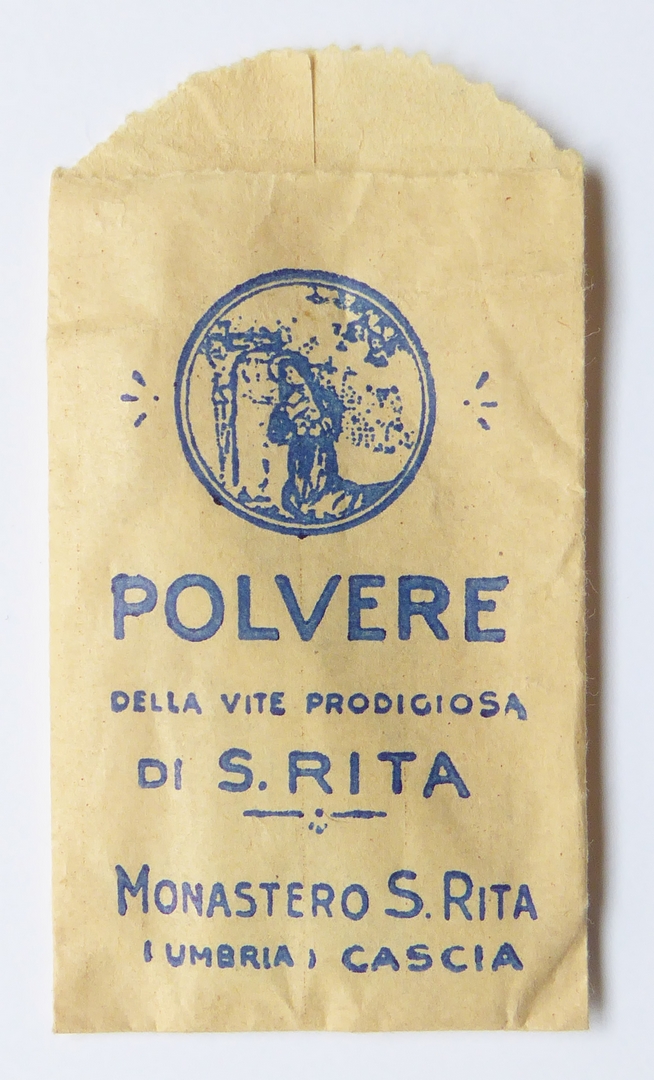 Papieren zakje met reliek uit bedevaartsoord: stof van de H. Rita