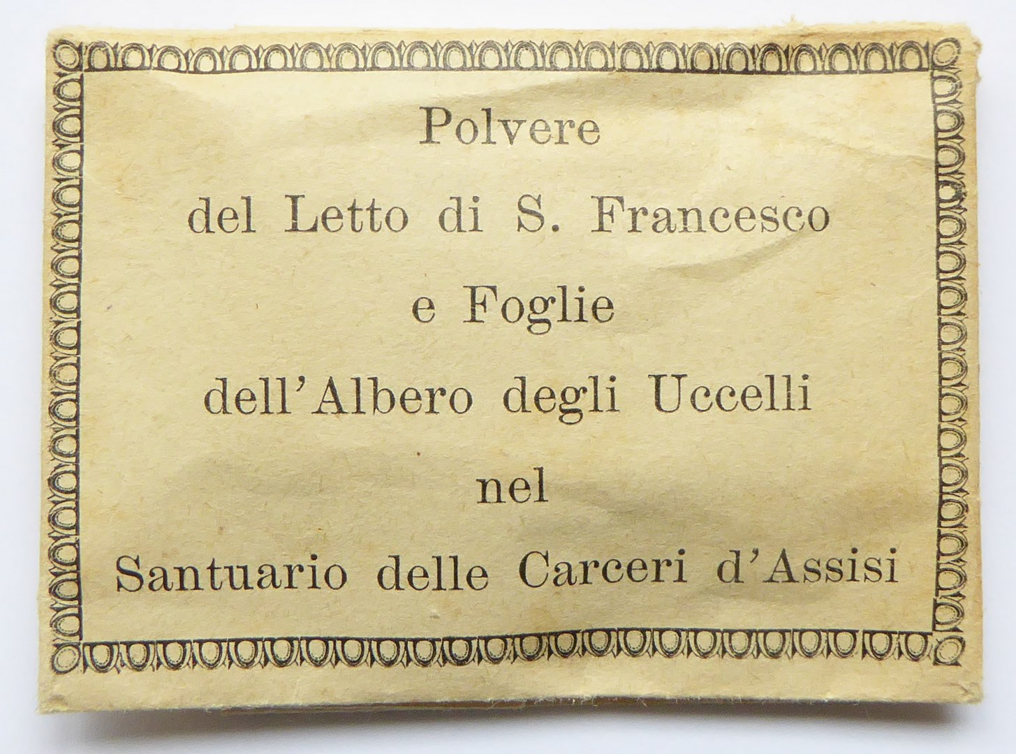 Papieren zakje met reliek uit bedevaartsoord: stof van de H. Franciscus