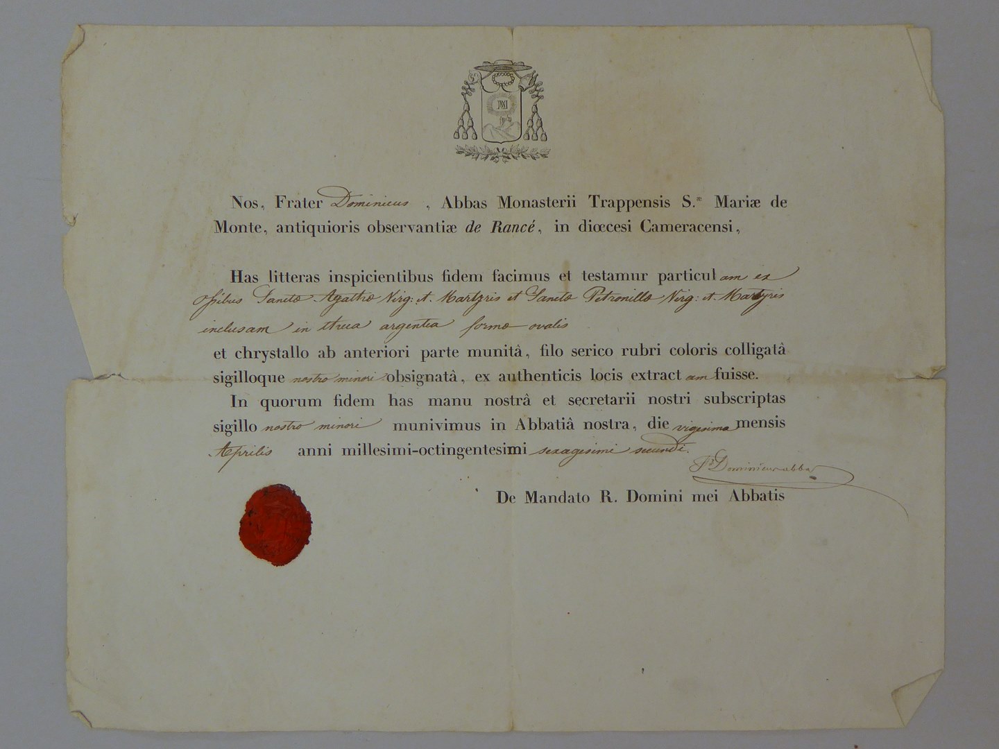 Echtheidsverklaring bij RMCC v301.14a met "Nos, Frater Dominicus, Abbas Monasterii Trappensis ..."