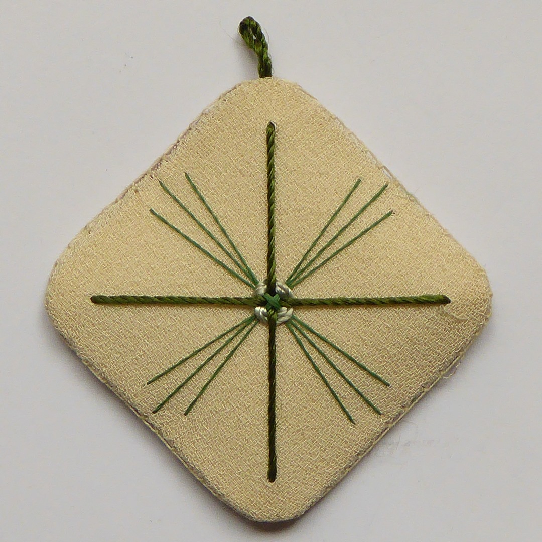 Ruitvormige witte reliekhouder met groen kruis waarin Agnus Dei