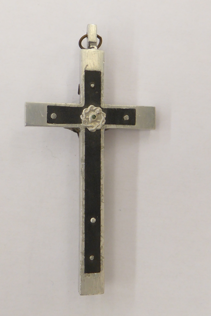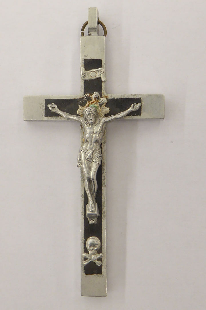Metalen kruis, zwart ingelegd, met corpus waaronder doodshoofd