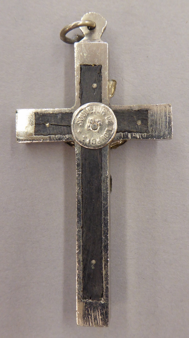 Kruis met metalen corpus, ingelegd met hout, van rozenkrans, kz. met "souvenir de Lourdes"