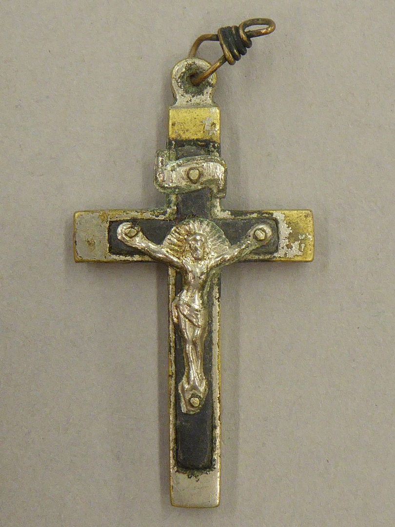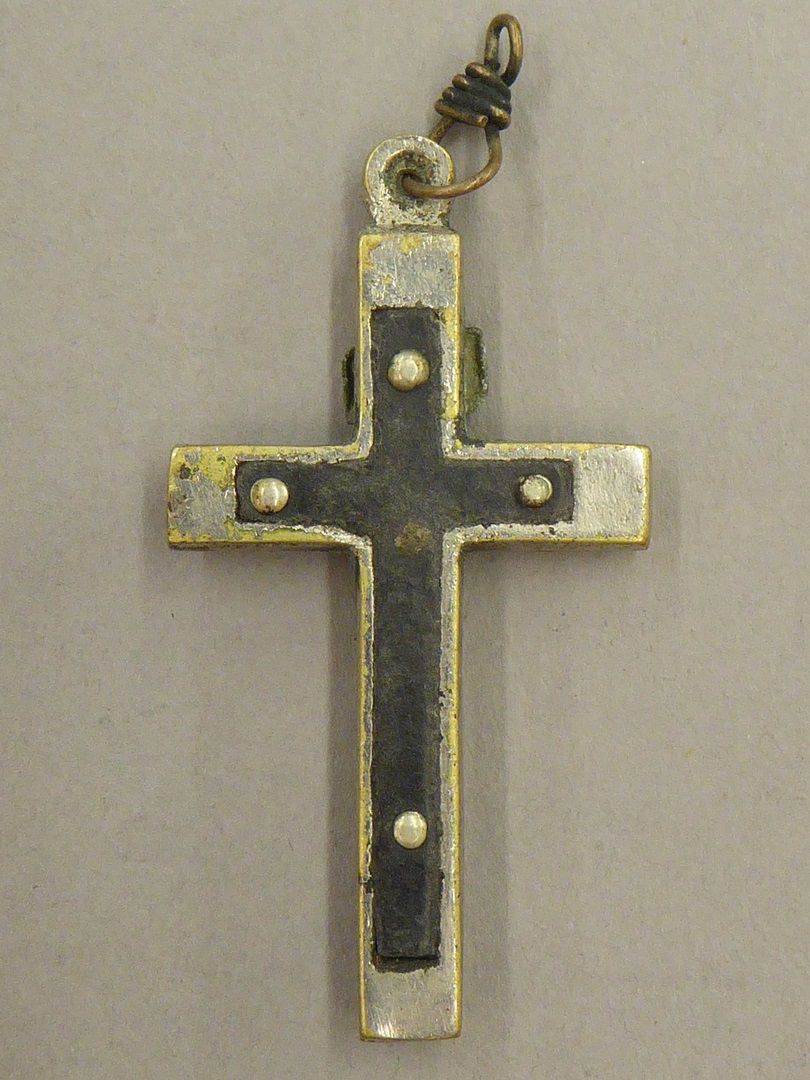 Kruis ingelegd met hout, met metalen corpus, afkomstig van rozenkrans